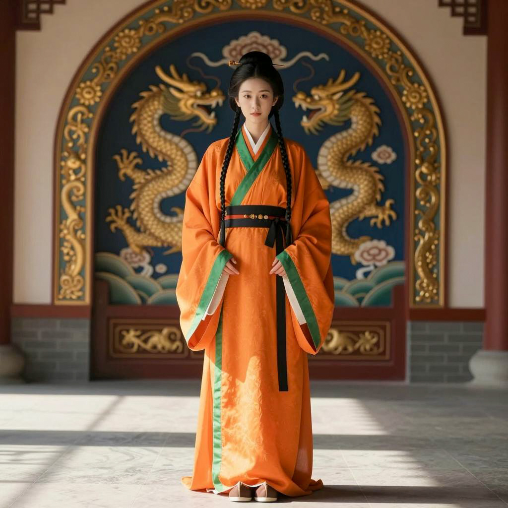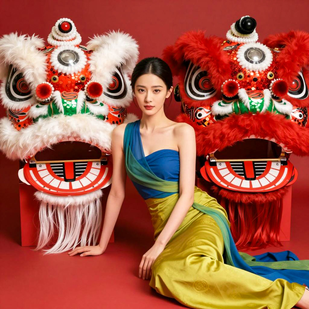 East Asian woman in colorful traditional dress with green, yellow, and blue layers, holding a bamboo fan. Red background with multiple vibrant, painted lion masks. Black hair in bun, red lipstick, neutral expression. Multiple masks behind her, some to the left and right. Bright, festive setting.