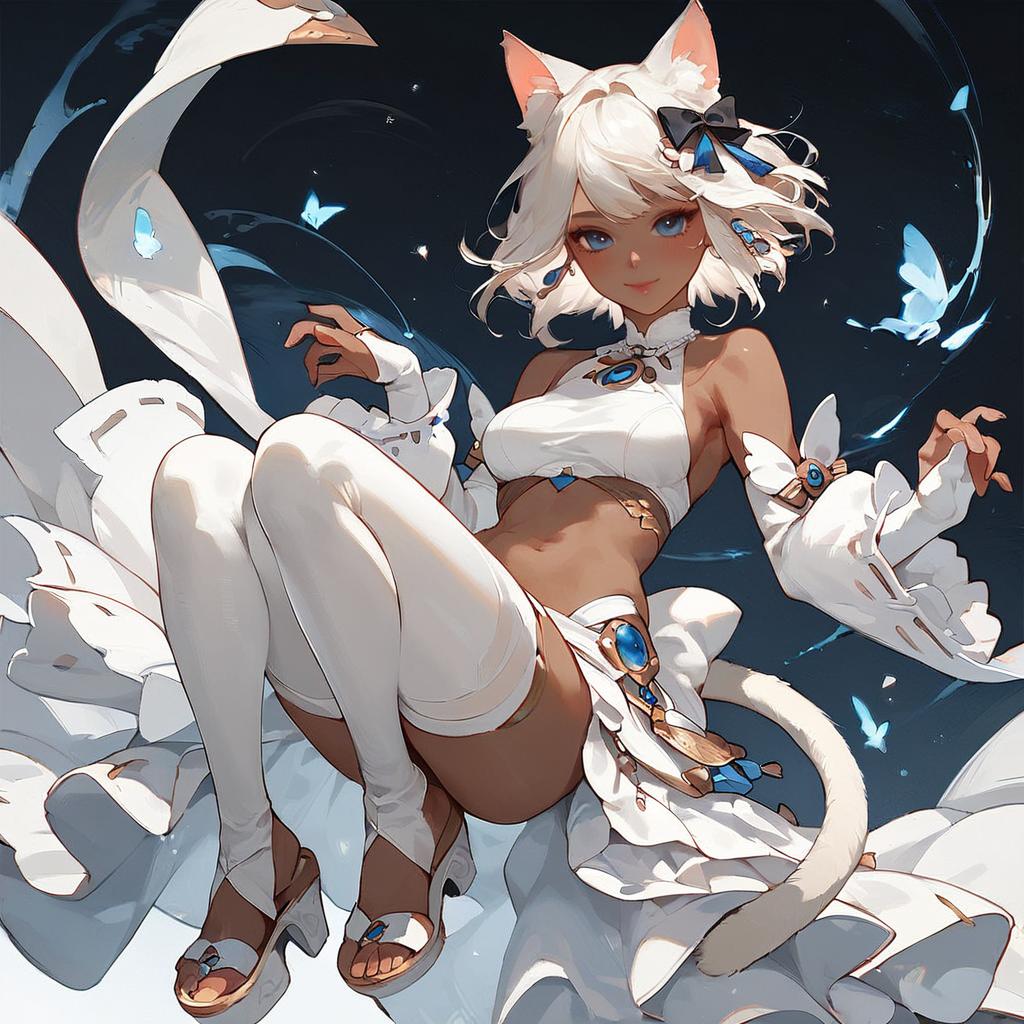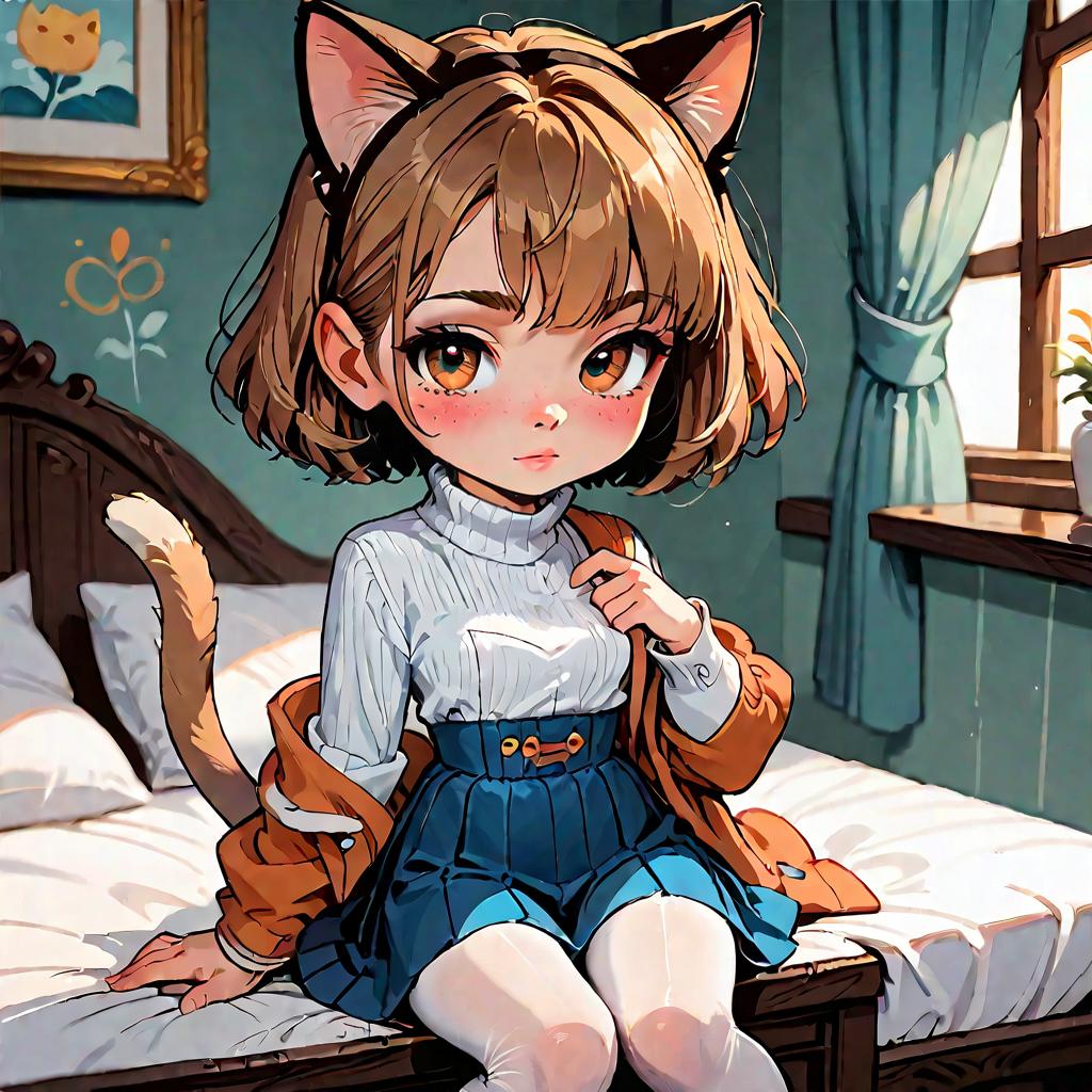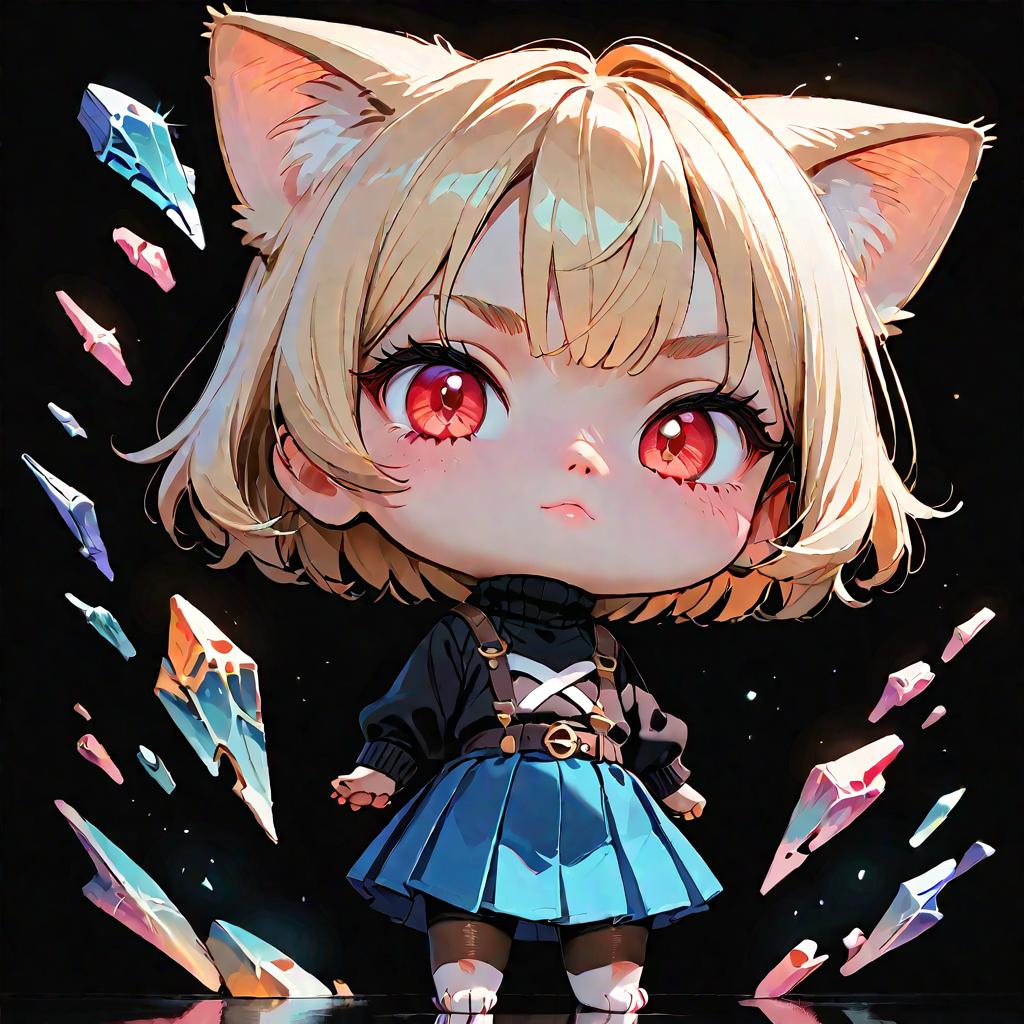 Score_9, score_8_up, score_7_up, score_6_up, IncrsXLBrknGls, broken glass, reflection, slit pupils, necoarc, chibi, :3, cat ears, blonde hair, red eyes, glowing eyes, black background, turtleneck, blue skirt, pleated skirt, pantyhose