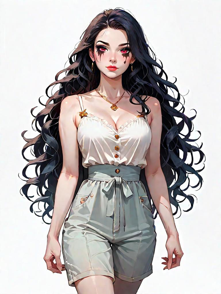 1girl, source_comics, realistic face, full body shot, Woman, casual chic, ivory spaghetti strap romper, draped v-neckline, cinched waist with subtle ruching, flared shorts, delicate gold pendant necklace, neutral makeup, wavy hair, plain white background