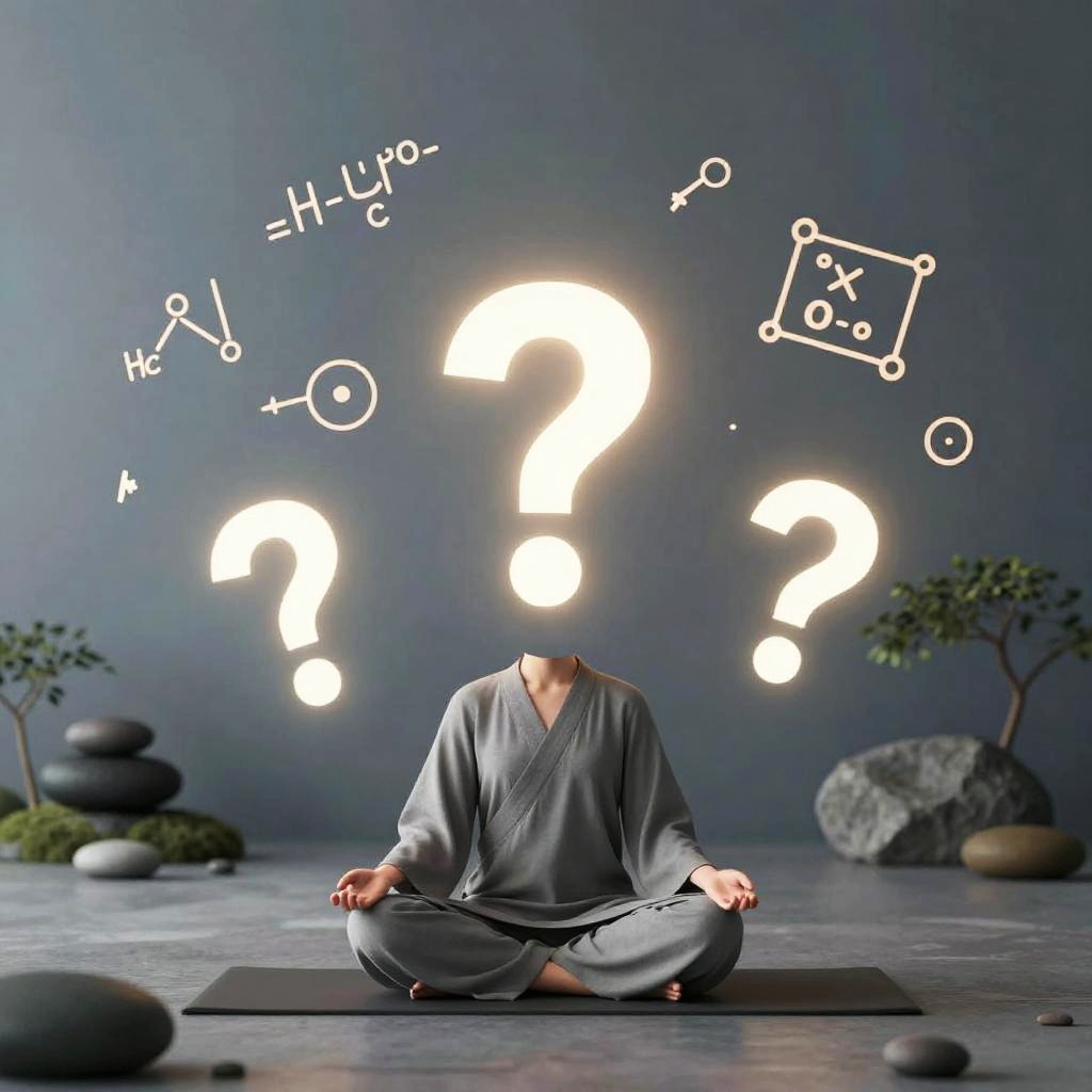 Agnostisch inspired scene depicting a peaceful meditation in a minimalist Zen garden with floating question marks and scientific formulas merging seamlessly, cool color palette with splashes of warm light, emphasizing harmony between knowledge and uncertainty.