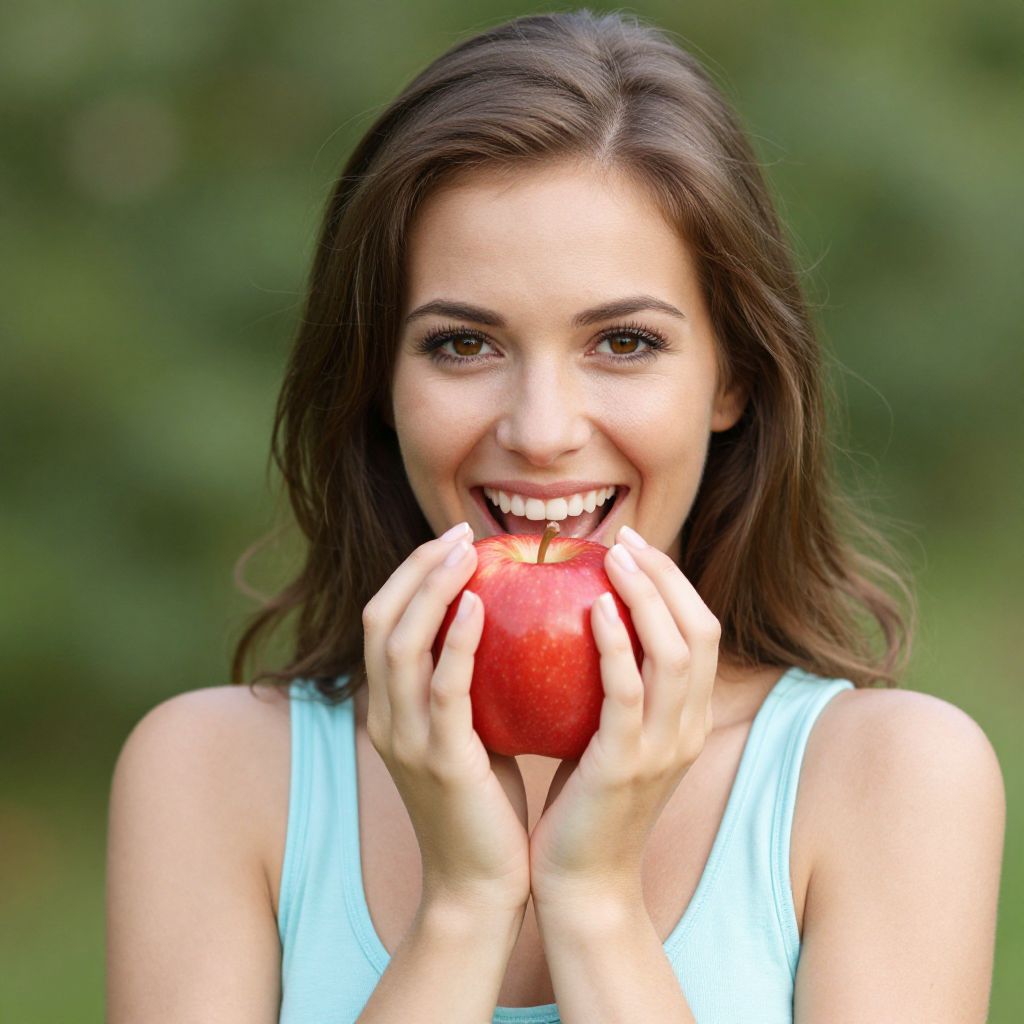 Photograph of a smiling young woman with dark brown hair, holding a red apple, wearing a white tank top, against a blurred green background.