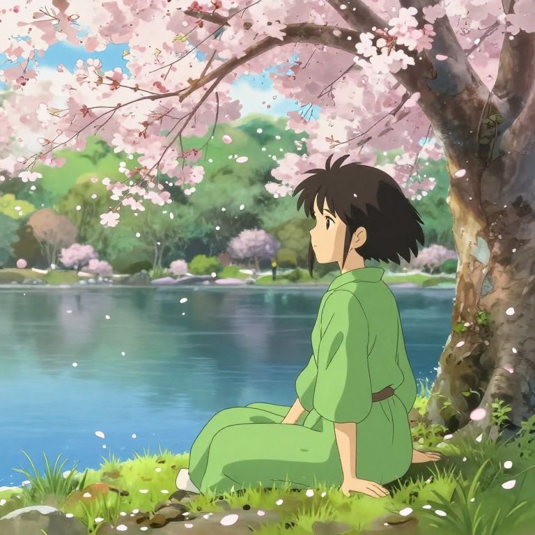 Anime characters that wear green sitting peacefully by a serene lake under cherry blossom trees, delicate petals falling, contemplative mood, detailed shading and soft pastel tones, showcasing the harmony between nature and character in classic anime style
