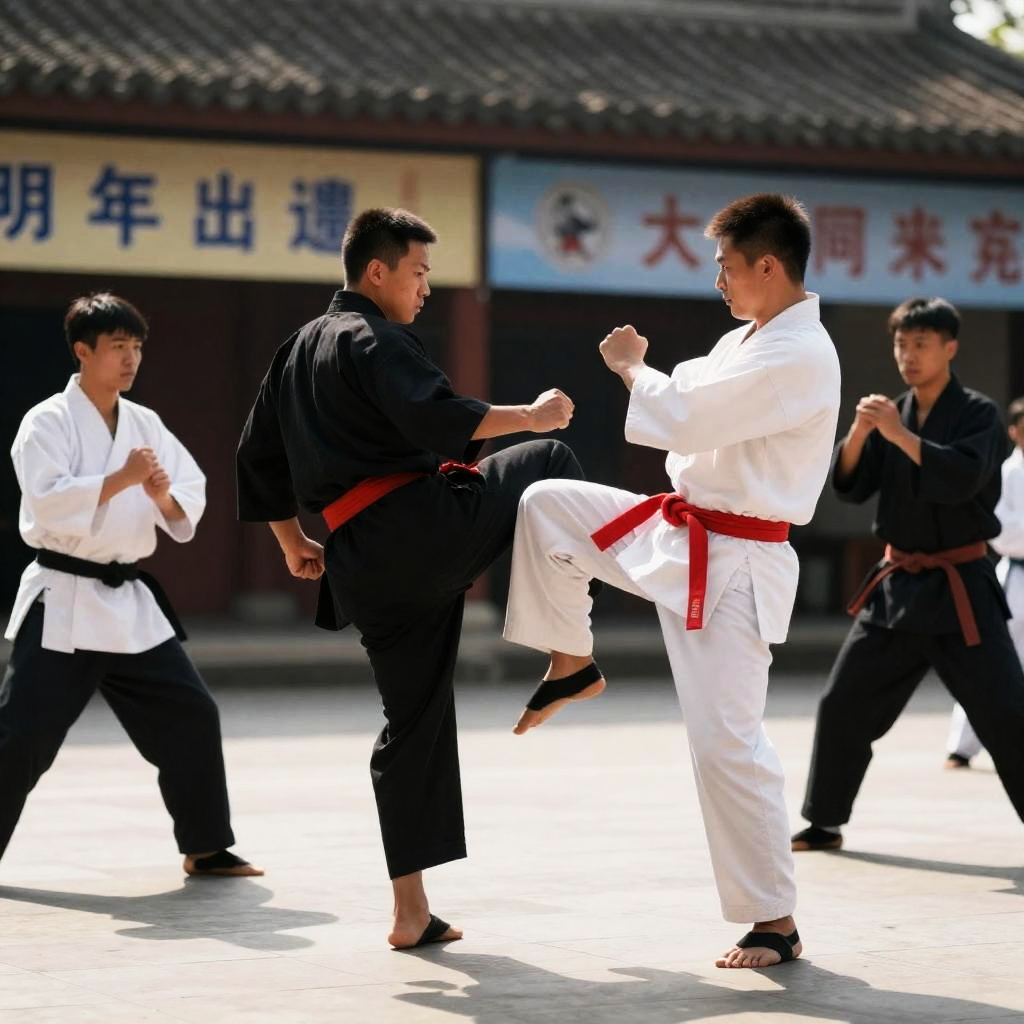 Photograph of a martial arts scene. Five Asian men in traditional uniforms. Central figure in black pants and red sashes kicks another in white pants. Other participants in mid-action poses. Background has banners and a building with a tiled roof. Sunlit, outdoor setting. Intense expressions.