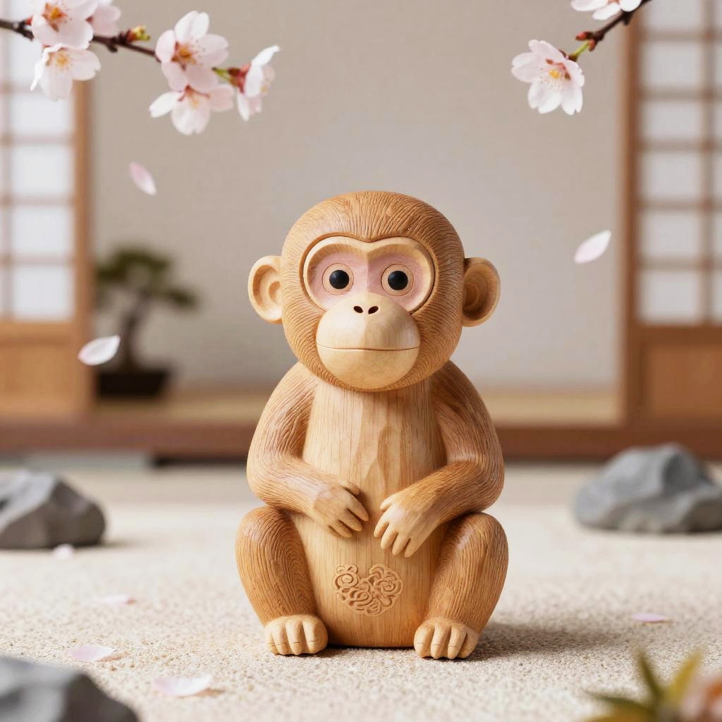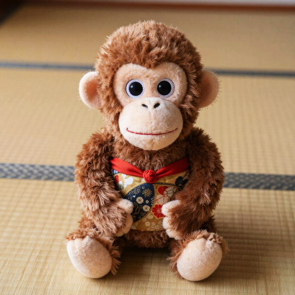Japanese monkey toy, colorful fabric doll wearing a tiny kimono, surrounded by Japanese lanterns and bamboo backdrop, vibrant and playful carnival vibe