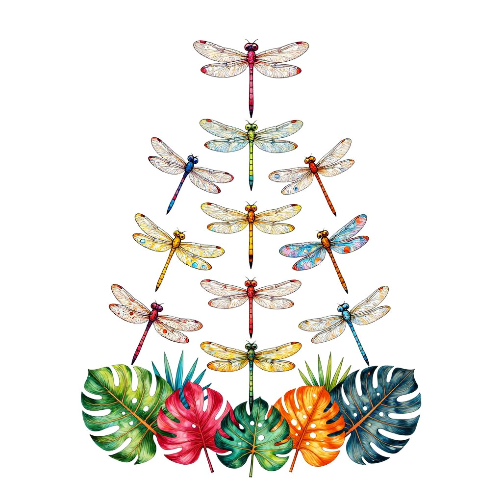 Monument Design a fabric effect drawing with dragonflies arranged in an irregular way, using vibrant tropical colors, hierarchical layout, white background, skin-friendly aesthetic.