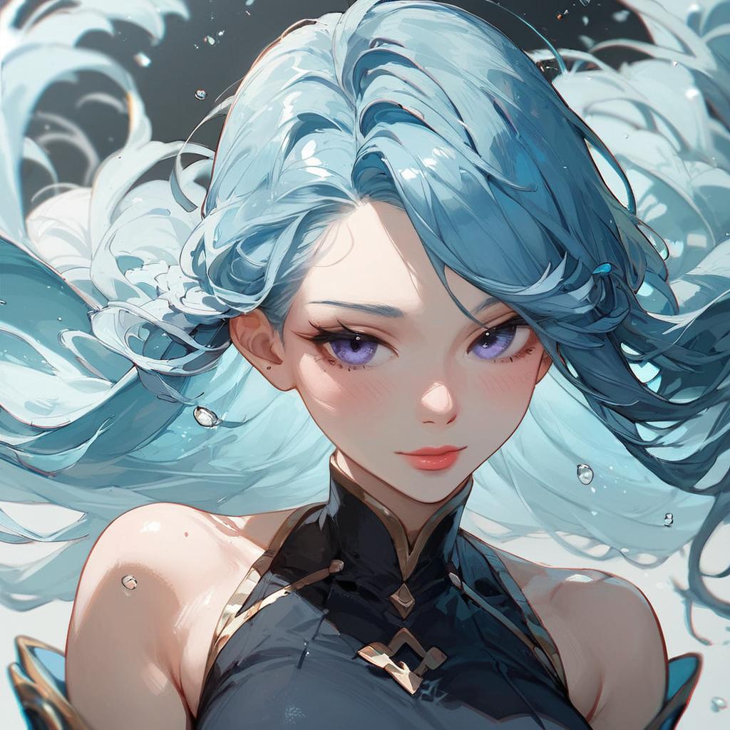 Score_9, score_8_up, score_7_up, score_6_up, source_anime, 1girl, mature female, cyan hair, wavy hair, glasses, earrings, white dress, brooch, underbust, long dress, bridal gauntlets, (huge breasts:0.7), upper body, city, blue sky, hair blowing in the wind, looking at you, smirk, very long hair