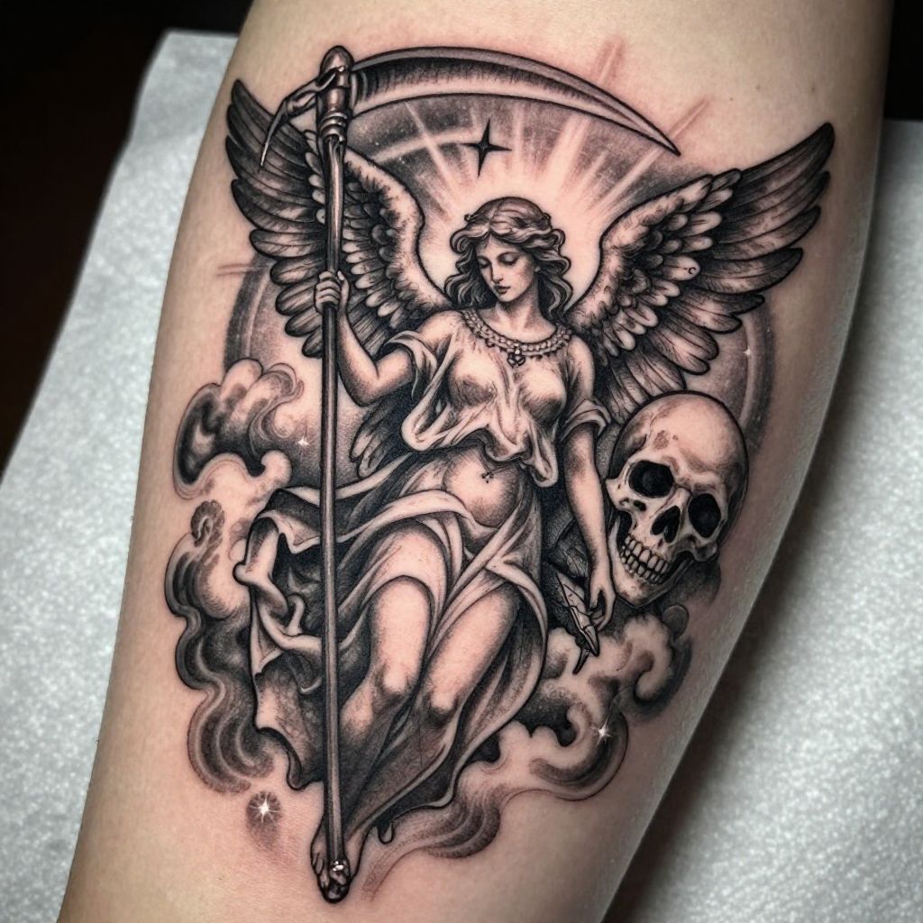 Angel and death tattoo concept, dynamic composition featuring a serene angel holding a scythe, surrounded by dark clouds and celestial light, fine line work with realistic textures, dramatic contrasts, symbolic representation of life and mortality