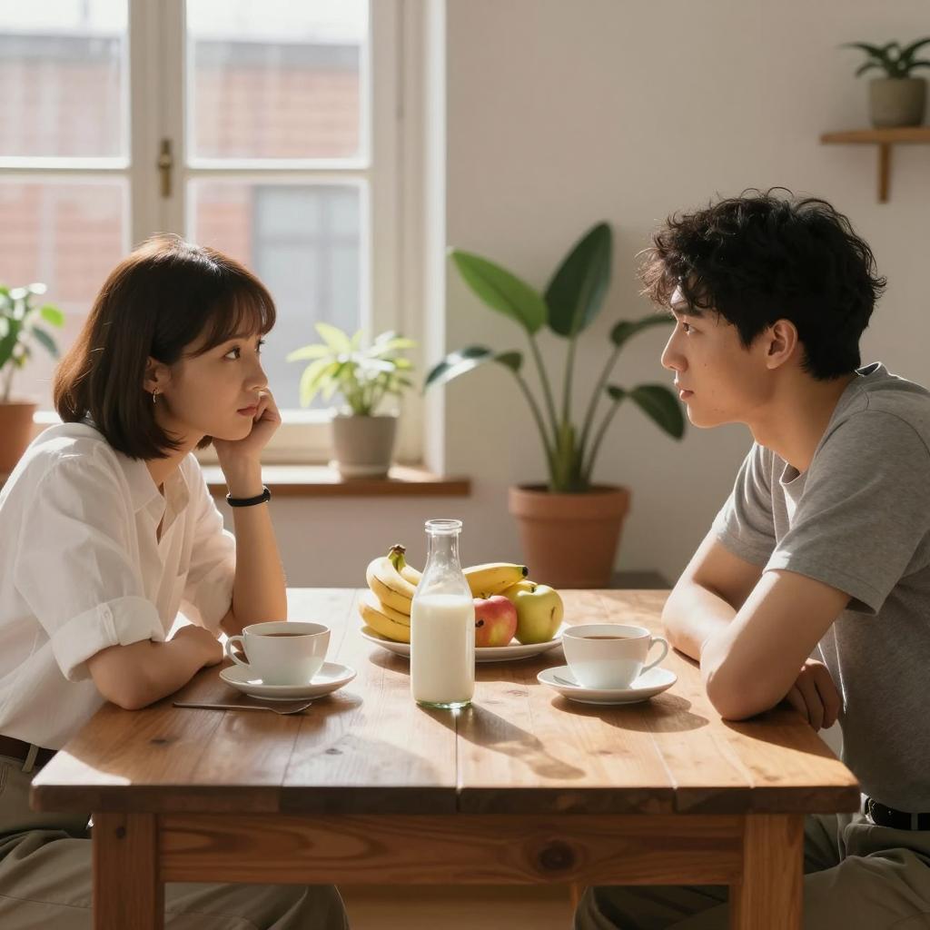 Dining scene in a retro restaurant. Man with glasses, brown jacket, and striped shirt sits on left, looking down. Woman with dark hair, white floral shirt, and white bow sits on right, eating. Both have drinks with straws. Background has plant, jukebox, and another person in the distance. Booths have patterned upholstery. Warm lighting.