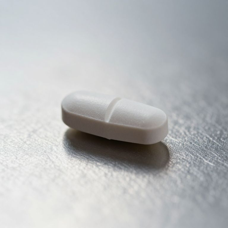 Artistic macro shot of a single Viagra pill resting on a textured metallic surface, reflecting soft diffused lighting, photorealistic style capturing pill details and glossy finish, modern healthcare concept