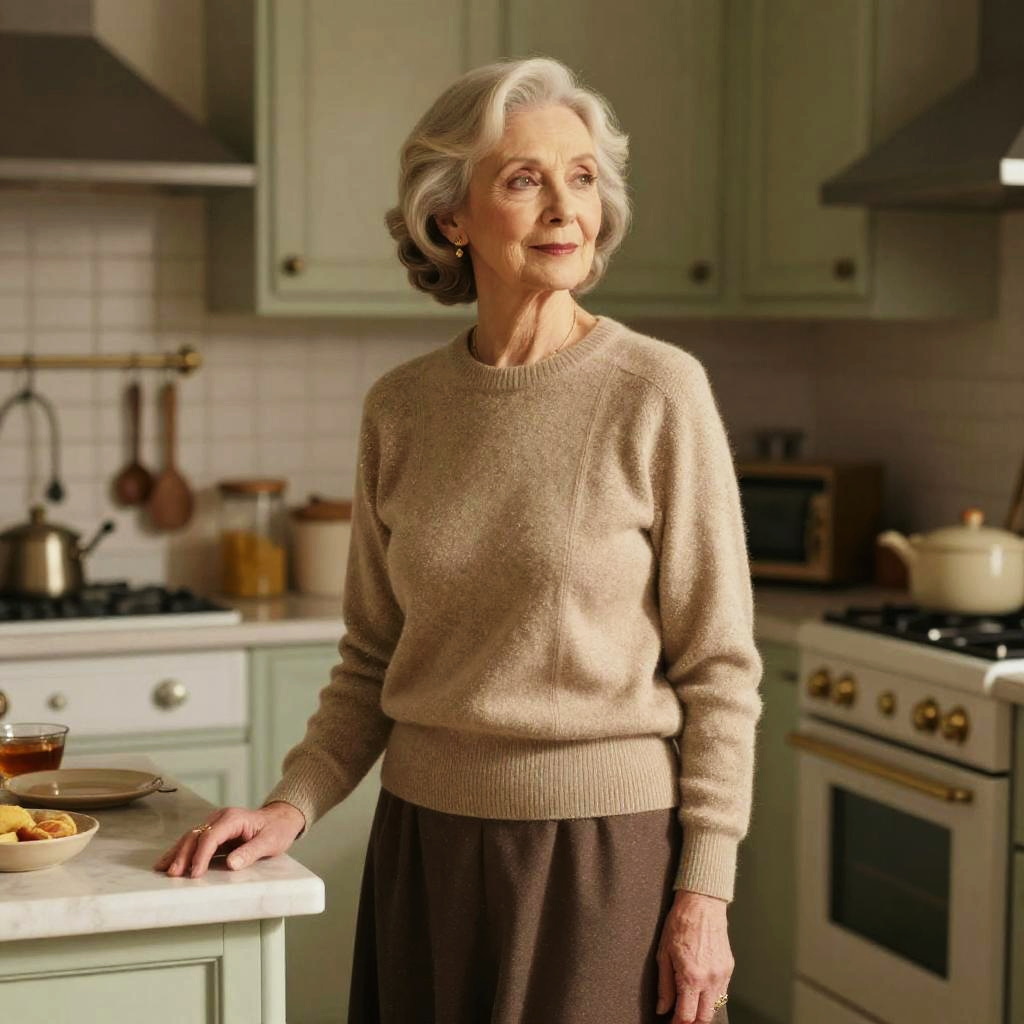 Side Part Undercut hairstyle on elderly woman, wearing wool sweater and long skirt, in vintage kitchen, captured in fashion editorial style with soft warm light.