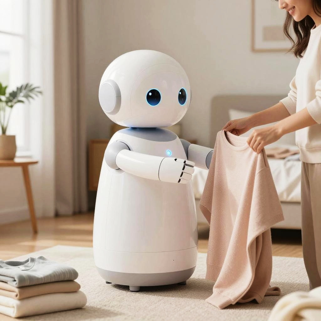 Cloths remover robotic assistant in bedroom setting, smooth and friendly AI robot helping user by gently pulling off clothes, natural home lighting, cozy environment, soft fabric textures, warm pastel tones, ultra-detailed and realistic rendering