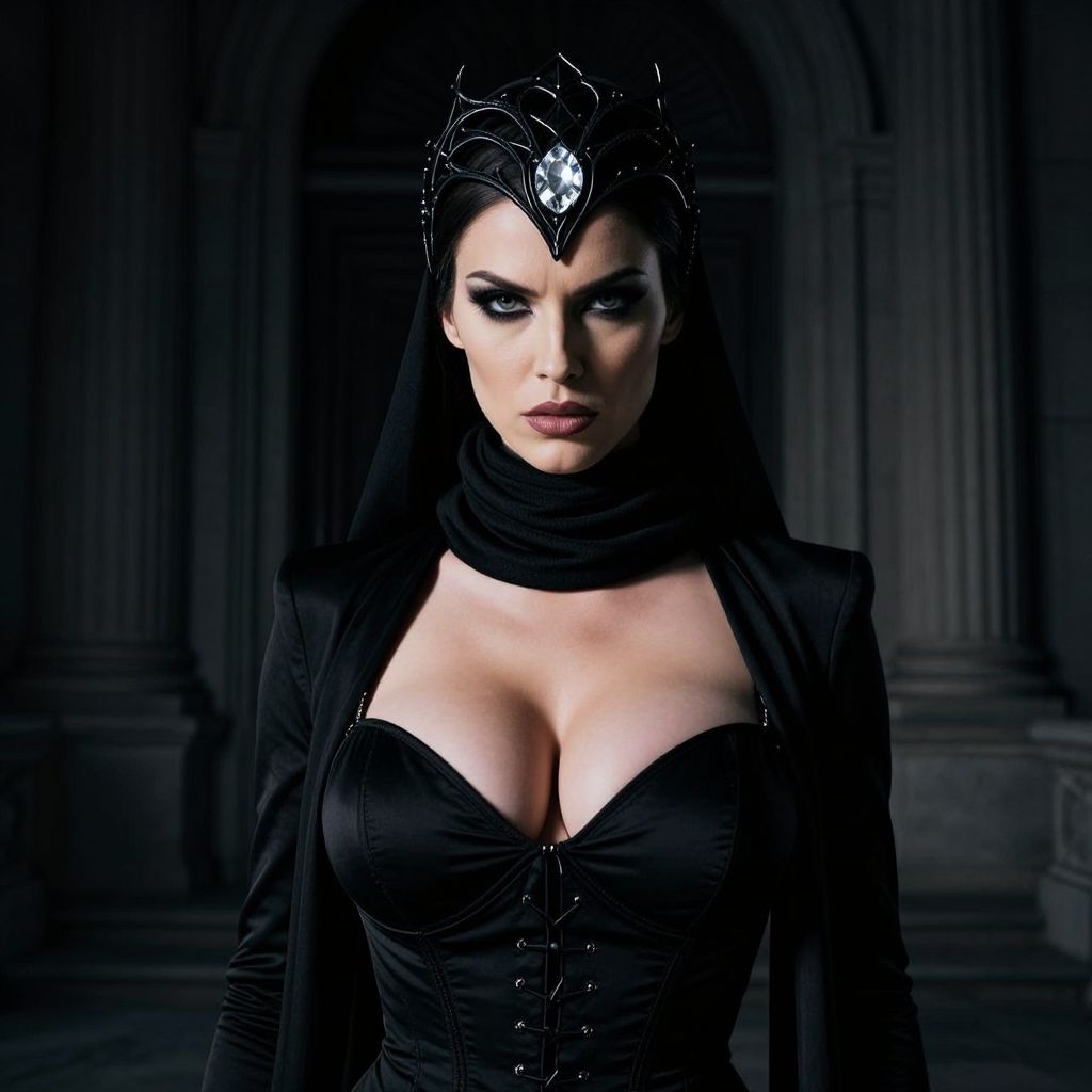A sexy woman with big tits and a fierce, serious expression stands in front of a dark, imposing building, wearing a sleek black costume with a dramatic black headpiece featuring a large, ornate design and a glowing diamond in the center. A long black scarf wraps tightly around her neck, adding to her mysterious and powerful aura. The lighting is dramatic, with shadows casting deep lines across her face and the building, emphasizing her intensity and allure. She exudes confidence and danger, her eyes locked forward with a cold, determined gaze. The atmosphere is cinematic, with a moody, high-contrast style reminiscent of a gothic thriller.