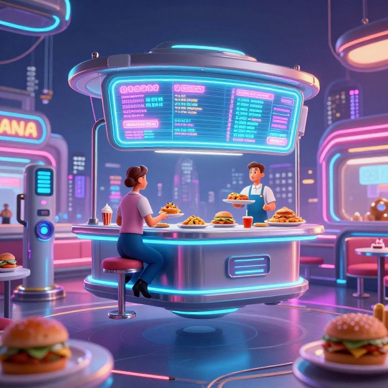 Dineria, animated style futuristic diner floating above a cityscape, holographic menus and robotic waiters serving classic diner food with a sci-fi aesthetic, bright neon tubing integrated with sleek metallic design, energetic and vibrant environment
