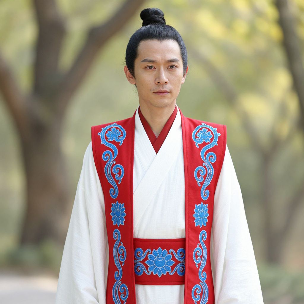 An Asian man with neat black hair tied up in a high, neat bun on his head, wearing a traditional and stylish red belt adorned with intricate blue symbolic patterns—such as scrolls, lotus flowers, and flowing lines—representing balance and harmony. He stands confidently in a serene outdoor setting, sunlight filtering through trees, with a calm and composed expression, reflecting wisdom and cultural depth.