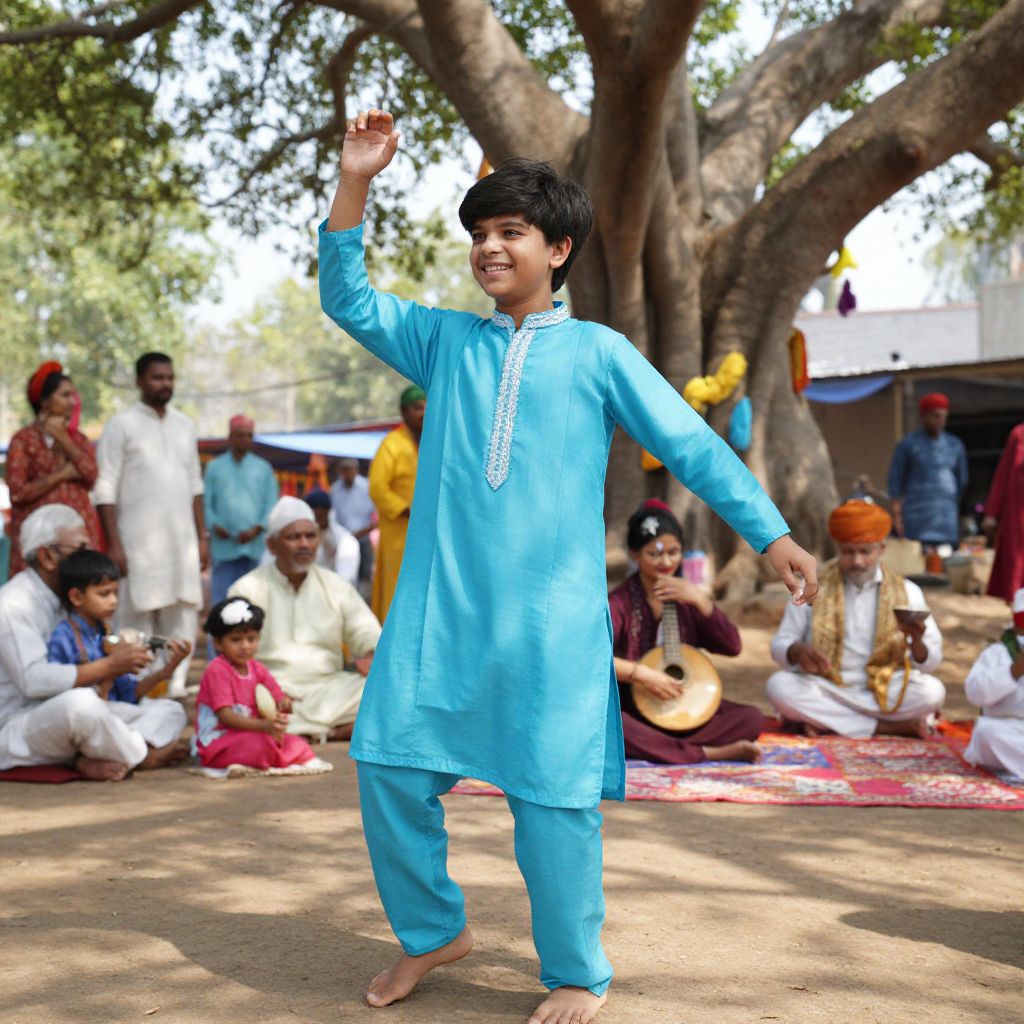 A vibrant sky blue salwar suit costume worn by a cheerful teenager with dark wavy hair and a bright smile, dancing in a festive village gathering under a large banyan tree, surrounded by elders and children, traditional music playing in the background.