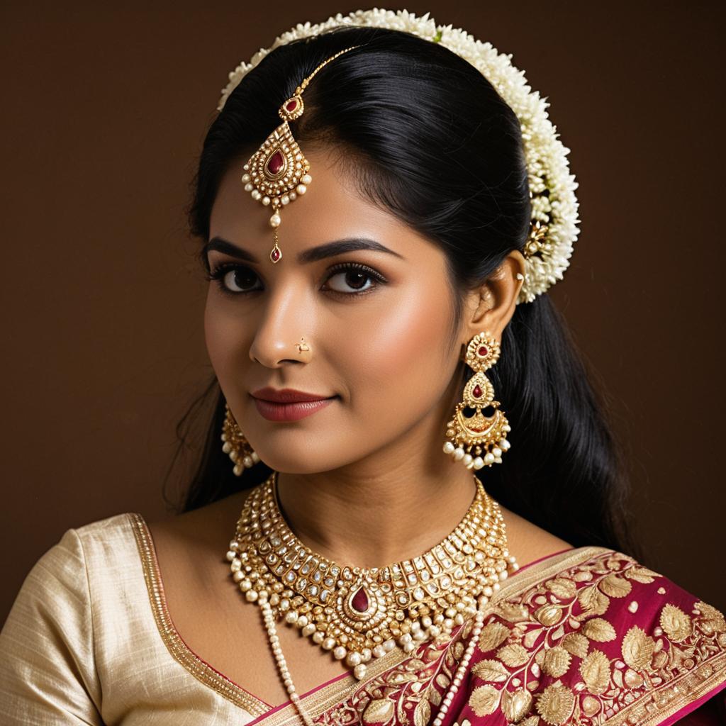 Portrait of a South Indian bride with traditional gold and pearl jewelry, including a maang tikka, earrings, and a necklace. She is wearing a cream and maroon saree with intricate gold embroidery and has black hair adorned with white jasmine flowers. The background is a solid brown, highlighting the bride's elegant and cultural appearance.