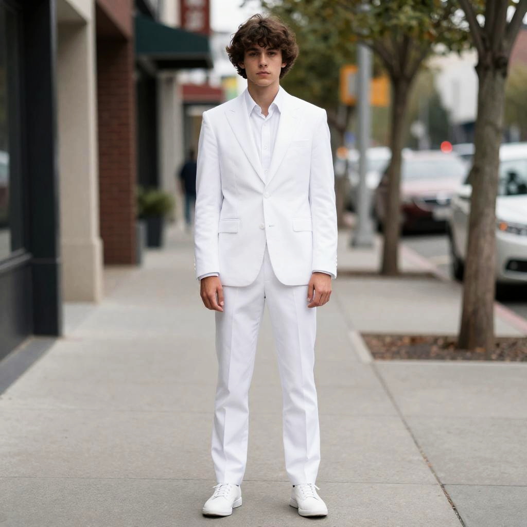 Man in White Suit on Sidewalk