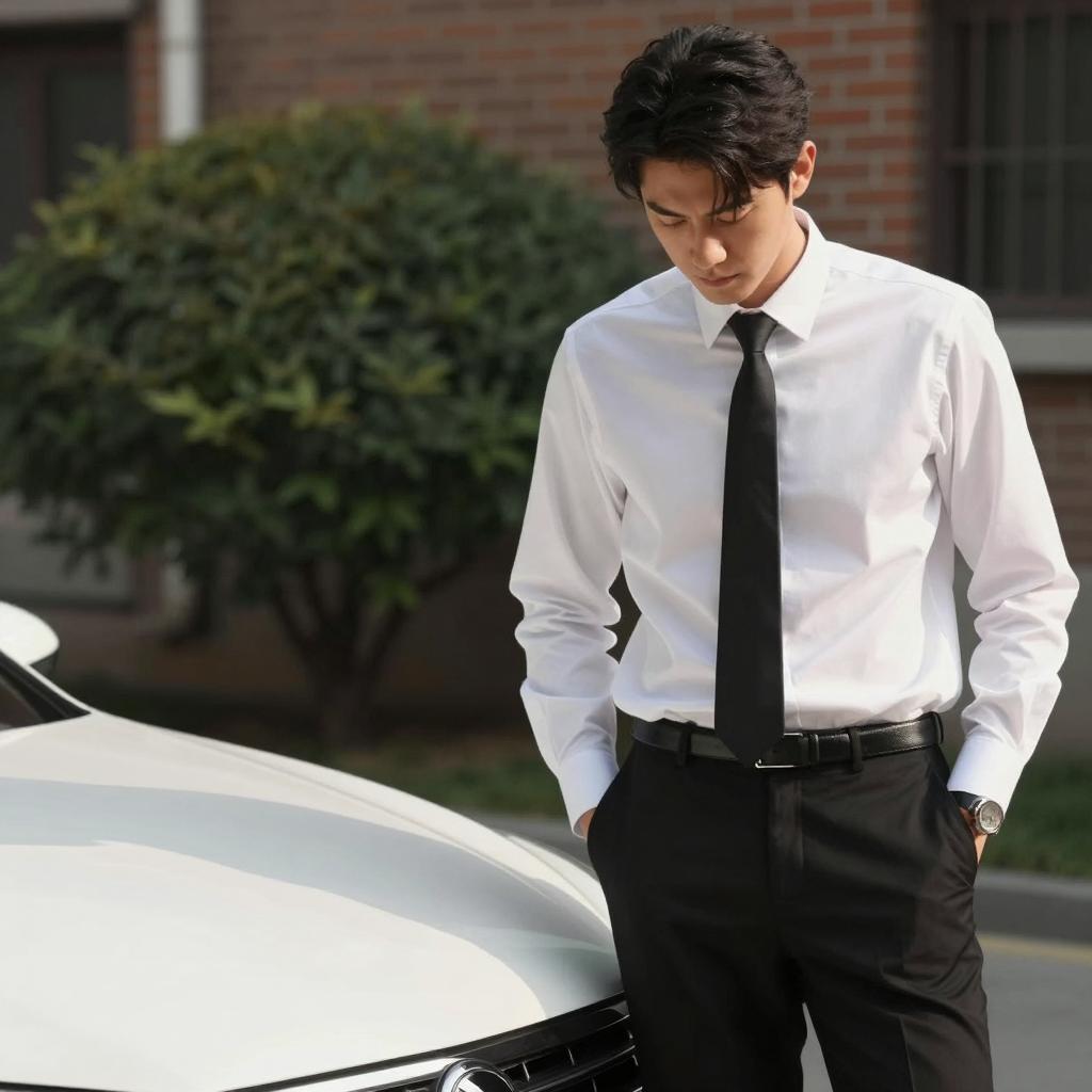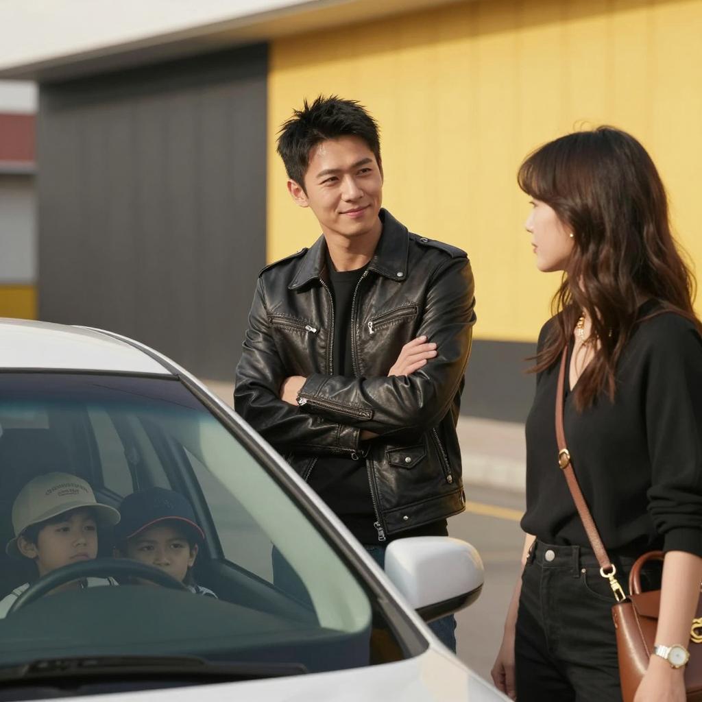 Two people next to a red convertible with a black top. Woman in front has wavy brown hair, wearing a pink dress and black-and-white jacket, looking down. Man behind has short dark hair, wearing a white shirt with black vest, looking ahead. Car's interior visible, forest background.