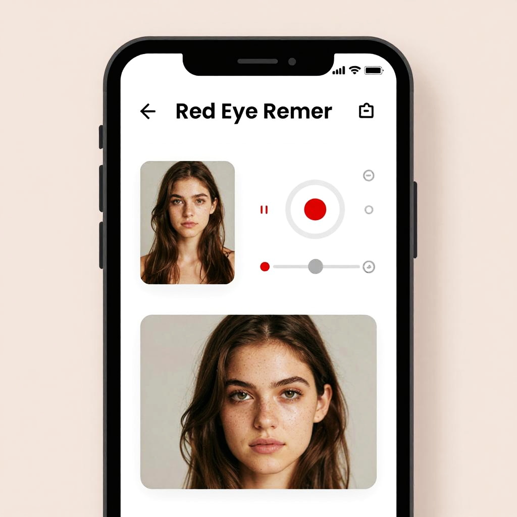 Detailed screenshot style image of a red eye remover online app, showing adjustments on a portrait photo, minimalistic user interface with sliders and preview window, soft pastel color scheme, professional and user-friendly design aesthetic