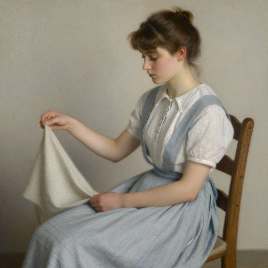 A serene digital illustration inspired by Impressionist techniques, reminiscent of Mary Cassatt's style, depicts a young woman seated on a wooden chair, delicately handling a piece of fabric, her attire featuring a vintage blouse and pinafore dress, bathed in soft, natural lighting that enhances the timeless elegance of the scene.