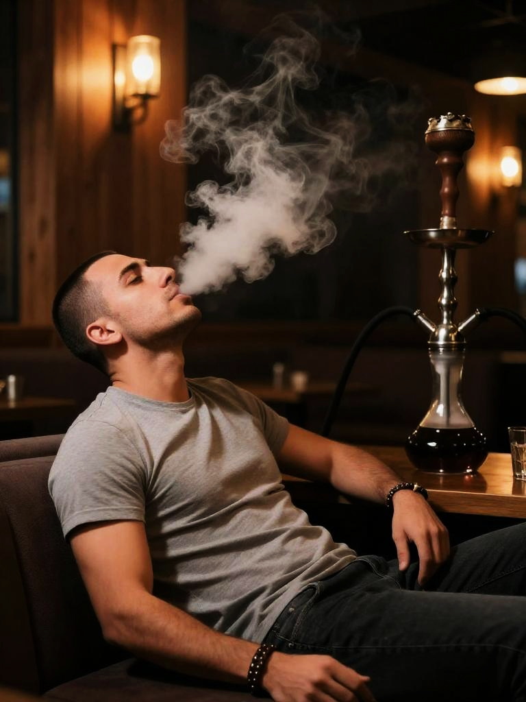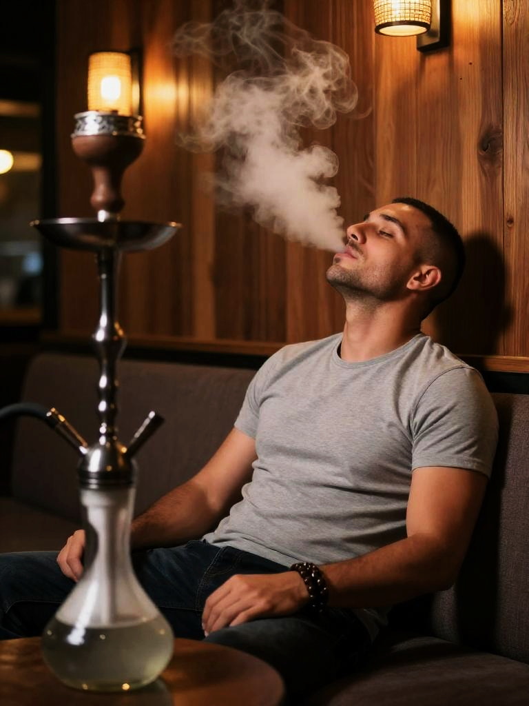 Man smoking shisha, adult man lounging in a stylish hookah bar, clean-shaven man with buzz cut wearing simple grey t-shirt with leather bracelet and dark jeans, leaning back against a sofa with head tilted upward, exhaling a long plume of smoke toward the ceiling, tall dark glass hookah standing on the table beside him, warm cosy lighting with wooden wall panels in the background, moody nightlife atmosphere, realistic photography, high resolution