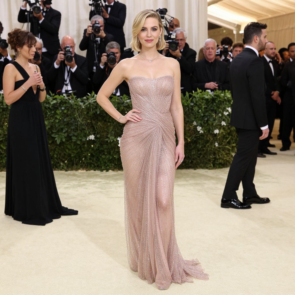 Elegantly dressed blonde woman in a sparkling pink gown poses confidently on the red carpet at the 2021 Met Gala, surrounded by formal guests and lush greenery in the background.