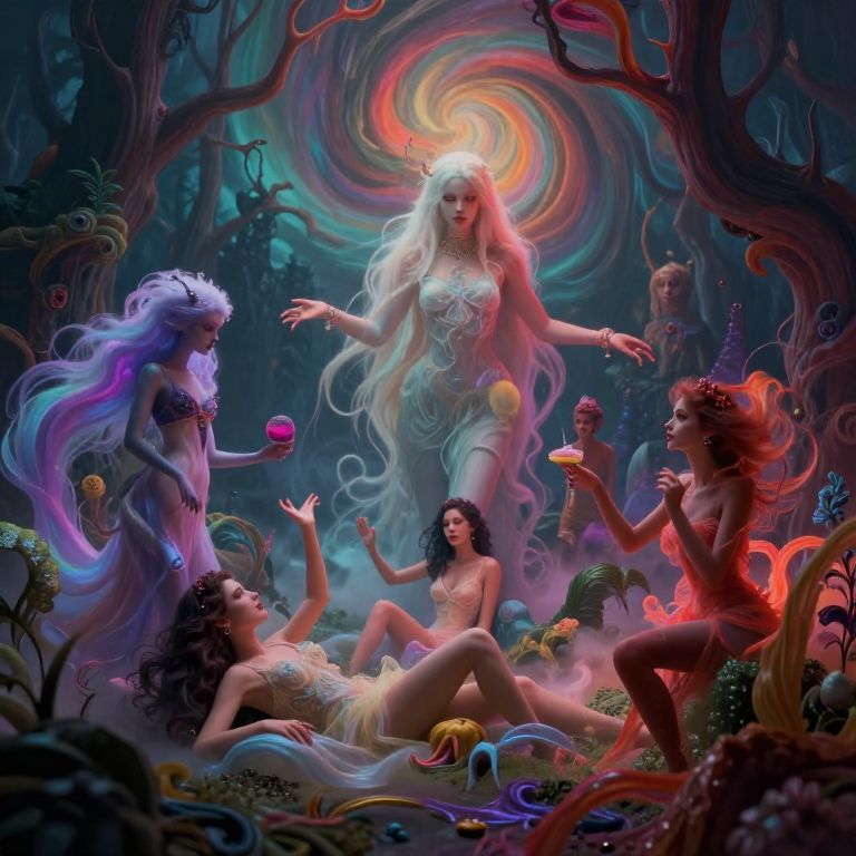 Digital fantasy artwork of mystical forest scene with ethereal, colorful, glowing women with long hair, holding flowers, surrounded by swirling light, mushrooms, and
