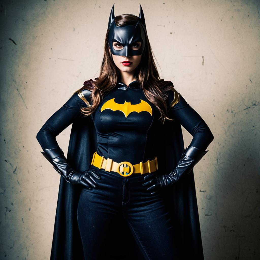 Portrait of a young woman wearing a Batgirl costume featuring a black and yellow bat symbol on the chest, black cape, black gloves, and a mask with bat ears. She has long brown hair, brown eyes, and red lips, standing confidently with hands on hips against a neutral grungy background.