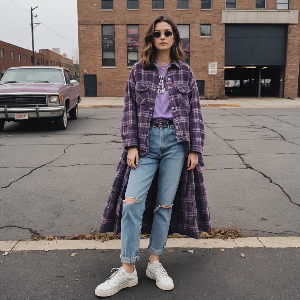 Photo of a Slender Calve woman, Textured Medium, 90s outfit, baggy ripped jeans in Dusty Purple, oversized flannel shirt in Fabric, graphic t-shirt, denim jacket, leather sneakers, grunge style, plaid patterns, muted colors, casual, vintage, retro, 1990s fashion, Classic Diner, vintage Goodman pollution curve