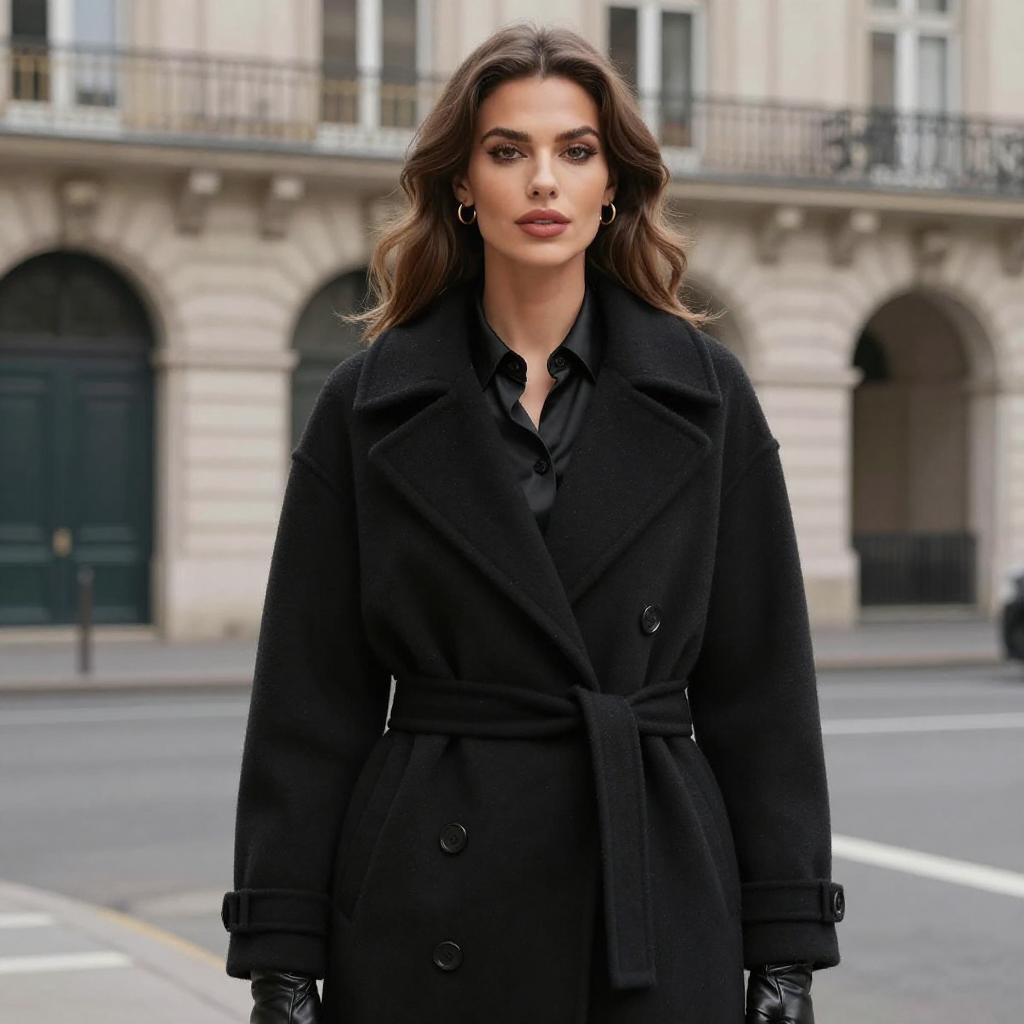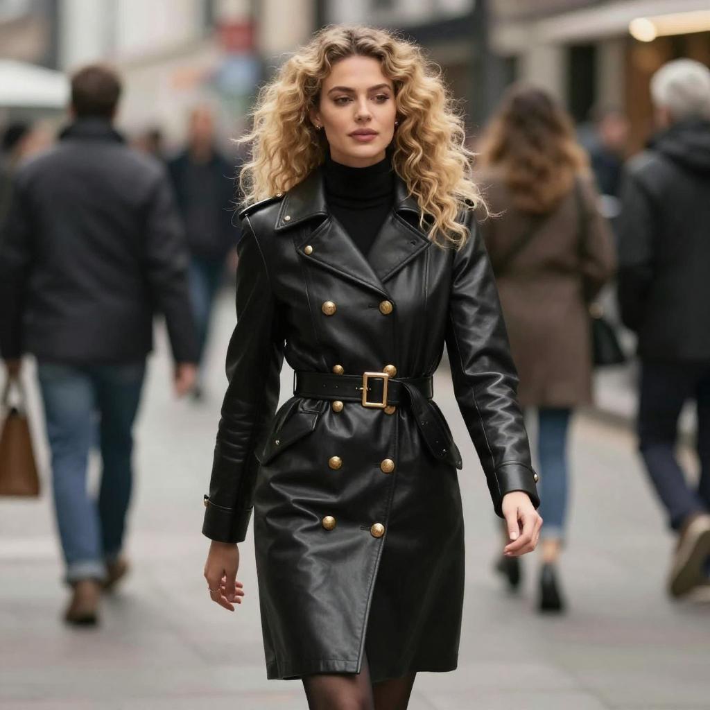 Portrait of a stylish young woman with voluminous curly blonde hair wearing a black leather coat with large gold buttons and a gold belt detail. She is walking confidently on a city street, with blurred pedestrians in the background. The setting suggests a fashionable urban environment.