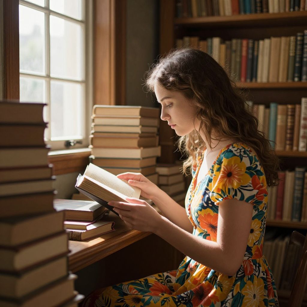 Photograph of a young woman with long brown hair in a colorful floral dress, reading a book in a sunlit library, surrounded by stacked books.