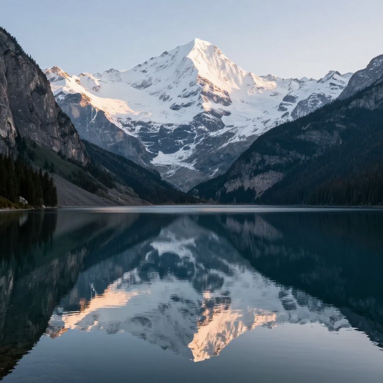 Photograph of a serene mountain landscape at dawn. A snow-capped peak dominates the center, reflecting perfectly in a calm, mirror-like lake below. The surrounding mountains are dark and forested, contrasting with the bright white snow. The sky is clear with a soft blue hue, and the early morning light casts a warm, pinkish glow on the snow's edges. The lake's surface is so still that it creates a nearly perfect symmetry with the mountains and sky above. The overall composition is tranquil and breathtaking, showcasing nature's beauty and symmetry.