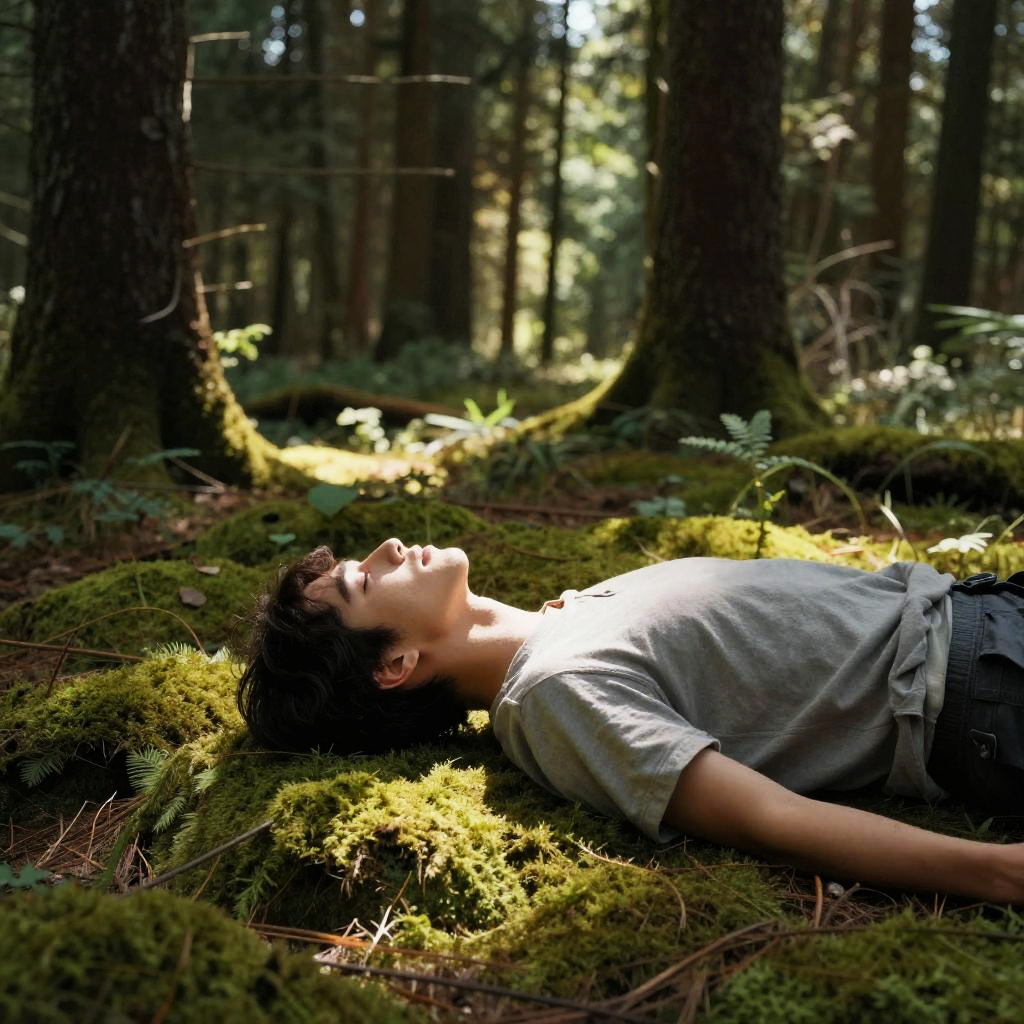 Person lying on ground in a historic library, surrounded by ancient books and warm wooden shelves, soft ambient lighting, a moment of quiet rest, vintage aesthetic with intricate details