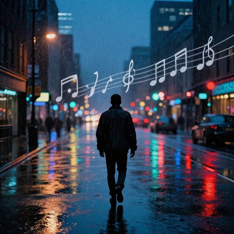 Photograph of a silhouette of a person walking down a rain-soaked city street at night, with glowing musical notes overhead and colorful reflections on the wet