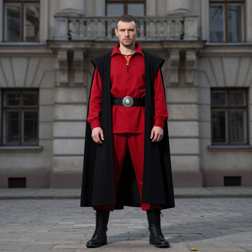 "Vlad Tepes, man in red and black outfit standing in front of a building"