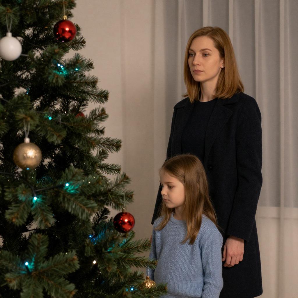 Photograph of a woman with light brown hair in a dark coat and a young girl with light brown hair in a blue sweater, standing by a decorated Christmas tree with colorful lights. The woman looks slightly to the side, while the girl looks downward. Curtains partially frame them. Warm indoor lighting.