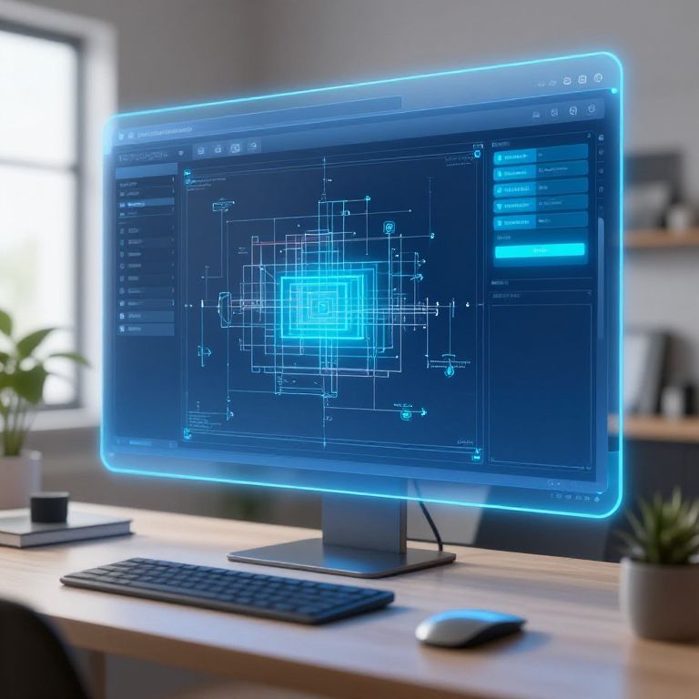Make blueprints online free: a dynamic application interface displayed on a holographic screen in a smart home office, showcasing blueprint layers and real-time editing tools, blue and cyan accents highlight focus areas, technology meets creativity in a futuristic setting