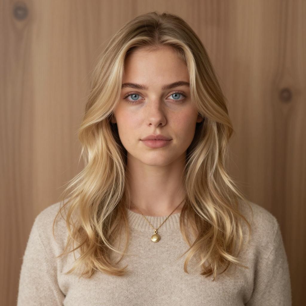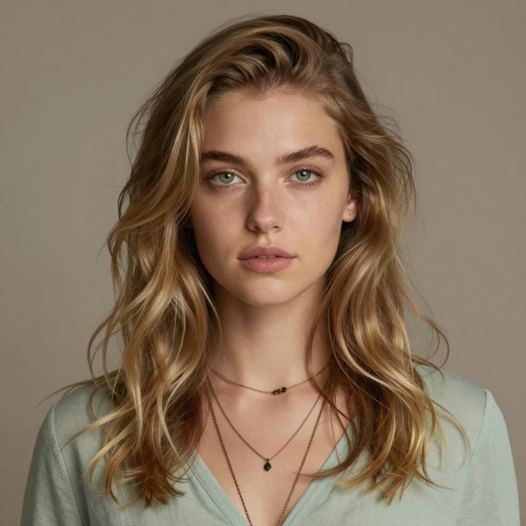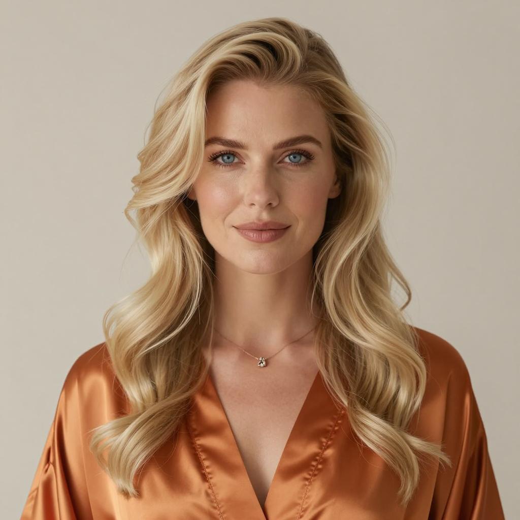 Once upon time hollywood, photorealistic, blonde woman, long wavy hair, green eyes, serious expression, wearing copper satin blouse with buttons, standing on street, blurred background, yellow car, buildings, palm trees, mountains in distance, warm sunlight, daytime, realistic lighting, close-up, medium shot, woman centered, urban setting, natural makeup, casual style, soft focus background, realistic ures, cityscape background