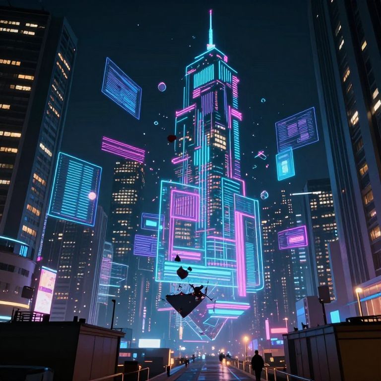 This digital artwork depicts a futuristic cityscape at night, centered on a towering skyscraper with neon blue and pink grid-like patterns illuminating its structure. Surrounding buildings, also lit with neon lights, form a dense urban environment. Floating neon blocks and geometric shapes, emitting vibrant cyan, pink, and purple hues, add a cyberpunk aesthetic. A silhouetted figure stands on a rooftop in the foreground, looking up at the illuminated skyscraper. The sky is dark, contrasting sharply with the glowing city lights. The overall style is reminiscent of cyberpunk art, with a mix of sharp lines and vivid colors.