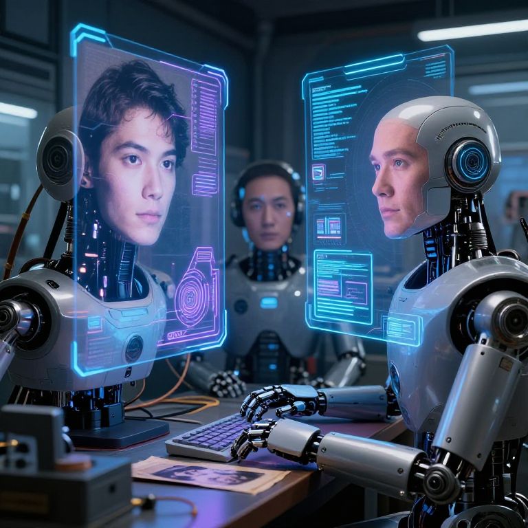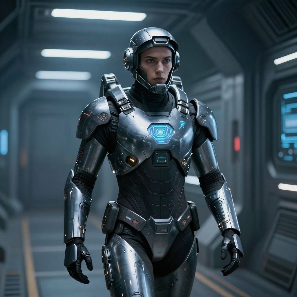 Two futuristic, silver-armored men in a sci-fi spaceship control room intensely focus on blue holographic screens, highlighting their high-tech, cybernetic
