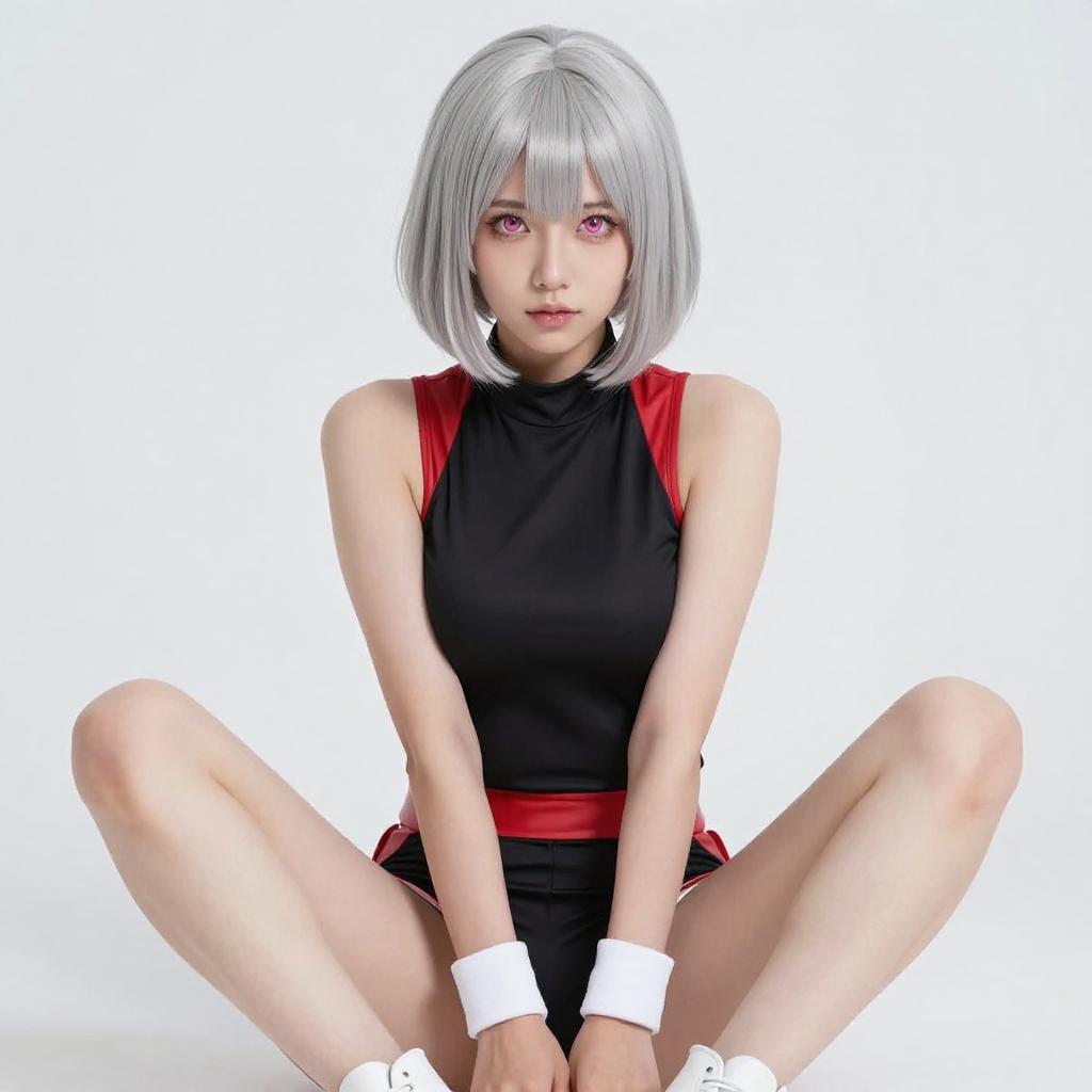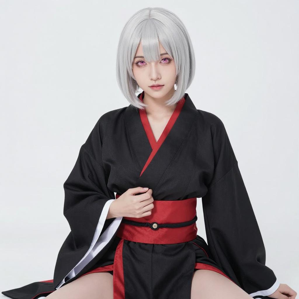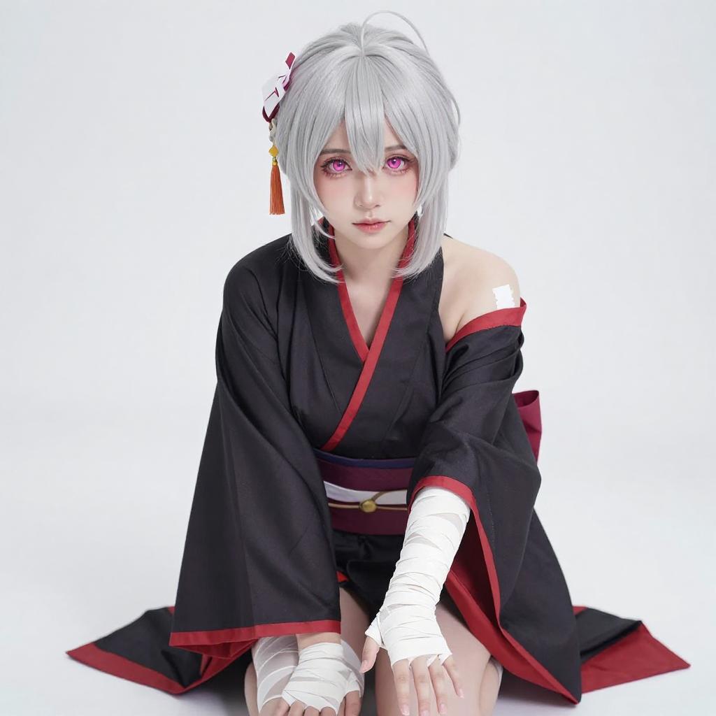 Photograph of an Asian woman with silver bob hair and pink eyes, wearing a black and red Japanese-inspired outfit with white bandages on her wrists and arms. She is kneeling, looking up with a slightly parted mouth. The background is a bright white, creating a stark contrast with her outfit and hair.