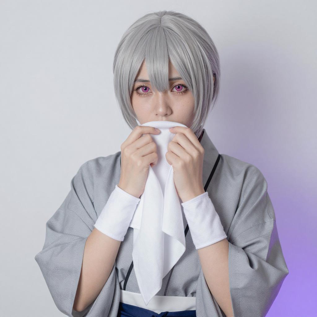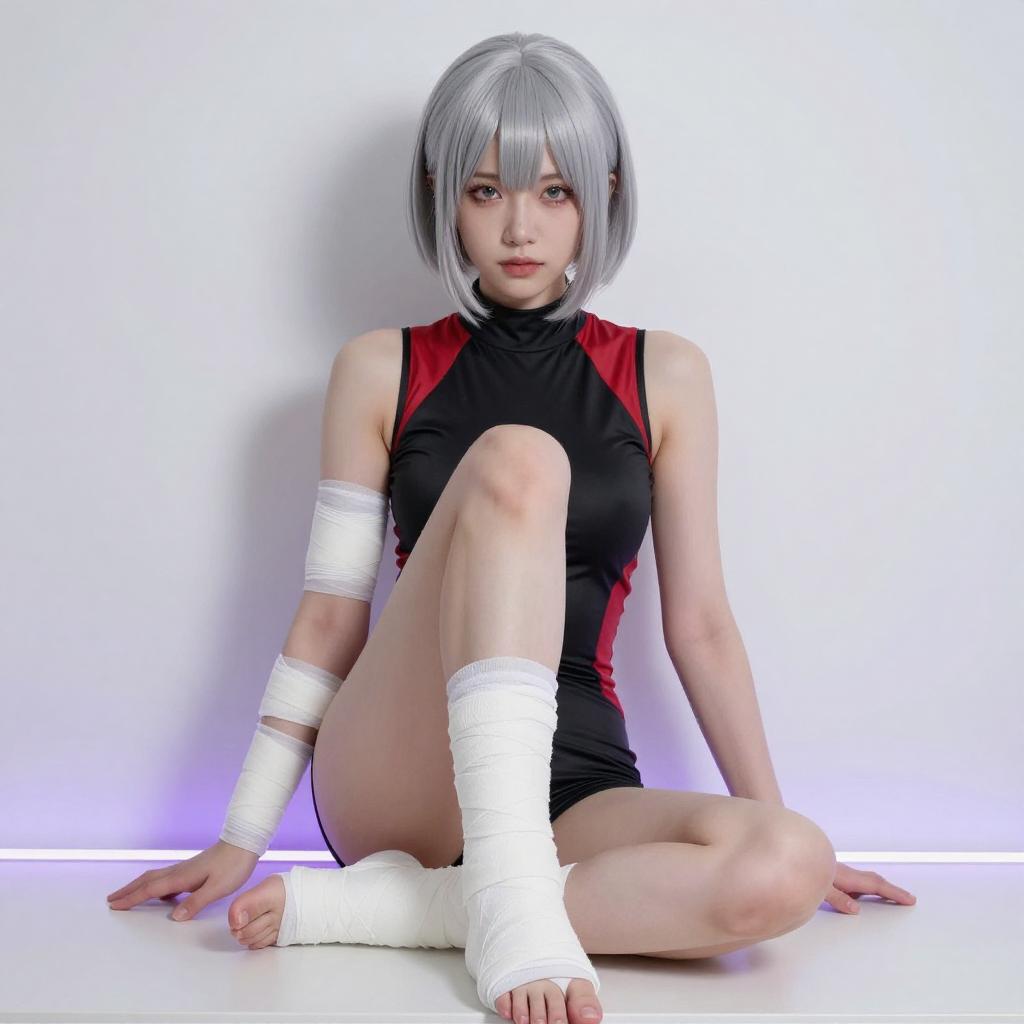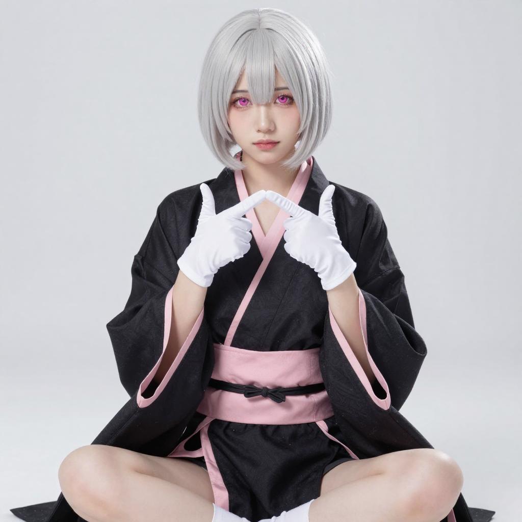 Photograph of an Asian woman with silver bob hair and pink eyes, wearing a black and red Japanese-inspired outfit with white bandages on her wrists and arms. She is kneeling, looking up with a slightly parted mouth. The background is a bright white, creating a stark contrast with her outfit and hair.