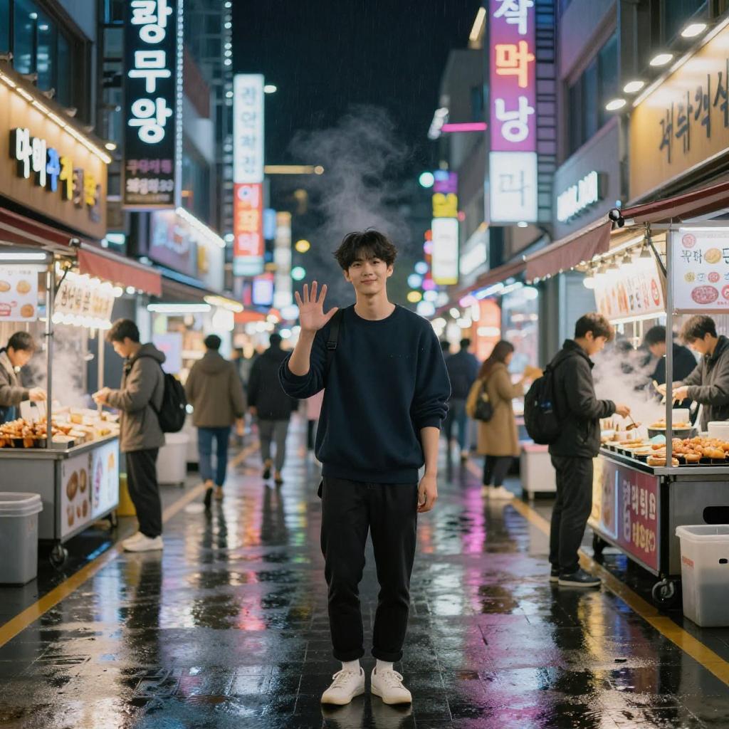 (8k, RAW photo, best quality, masterpiece:1.2), (realistic, photo-realistic:1.37), 1boy, athletic young man with short black hair, cute:1.2, neon-lit Myeongdong shopping street, Seoul — crowded cosmetic and fashion storefronts with Hangul signs, illuminated marquees and street food carts, light night rain, glossy wet pavement reflecting multicolored neon hues, steam rising from tteokbokki and hotteok stalls, cool blue-magenta mixed lighting, soft mist and visible raindrops, professional lighting, rim light, photon mapping, radiosity, physically-based rendering, PBR, atmospheric perspective, front-facing, whole body, delicate face, soft smile, looking at viewer, five fingers, natural skin, minimal makeup, DSLR street photography, 35mm lens, shallow depth of field, film grain, high contrast, color graded, candid vibe, selfie pose