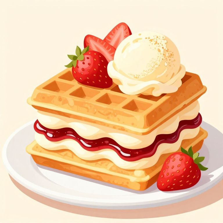 A vibrant vector illustration of a layered sweet pastry, featuring golden-brown waffles, creamy white filling, rich red jam, fresh strawberries, and a dollop of vanilla ice cream, all presented on a pristine white plate with soft, warm lighting that enhances its appetizing appeal.