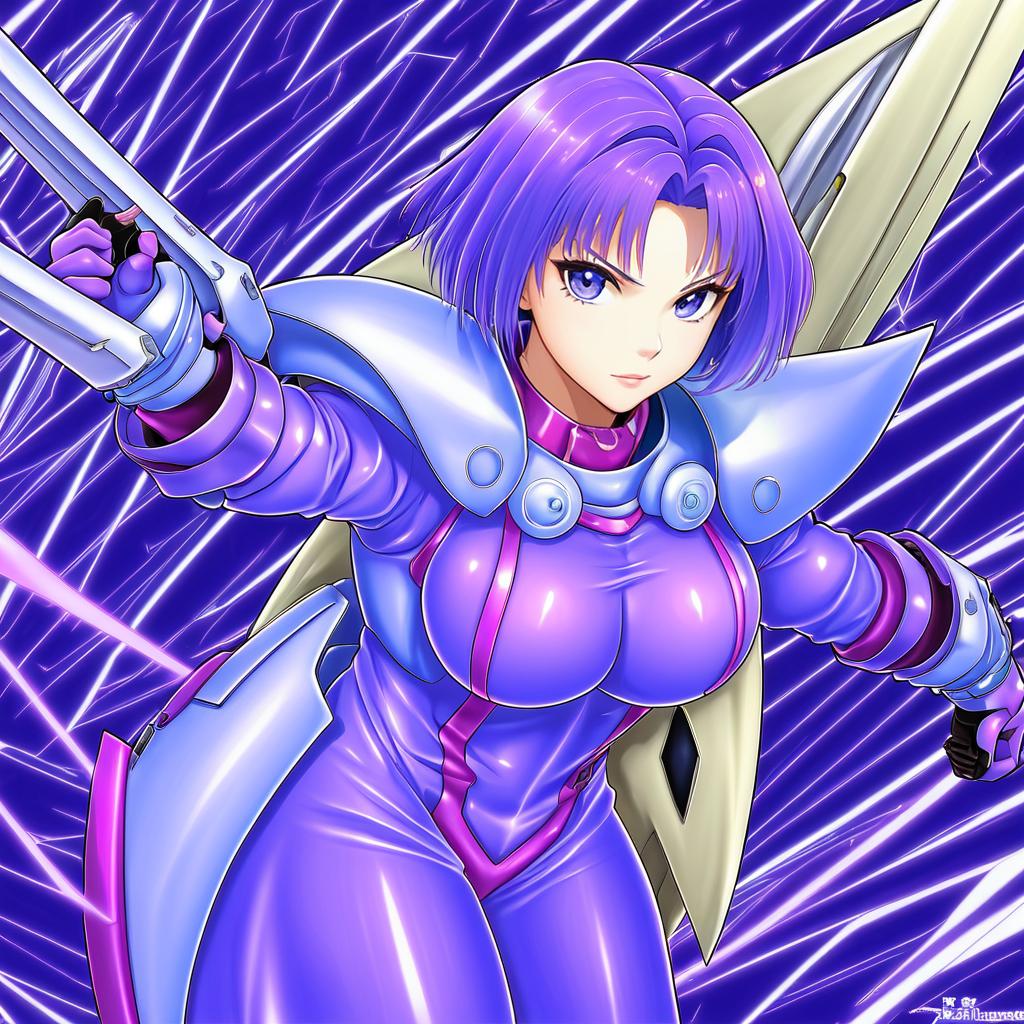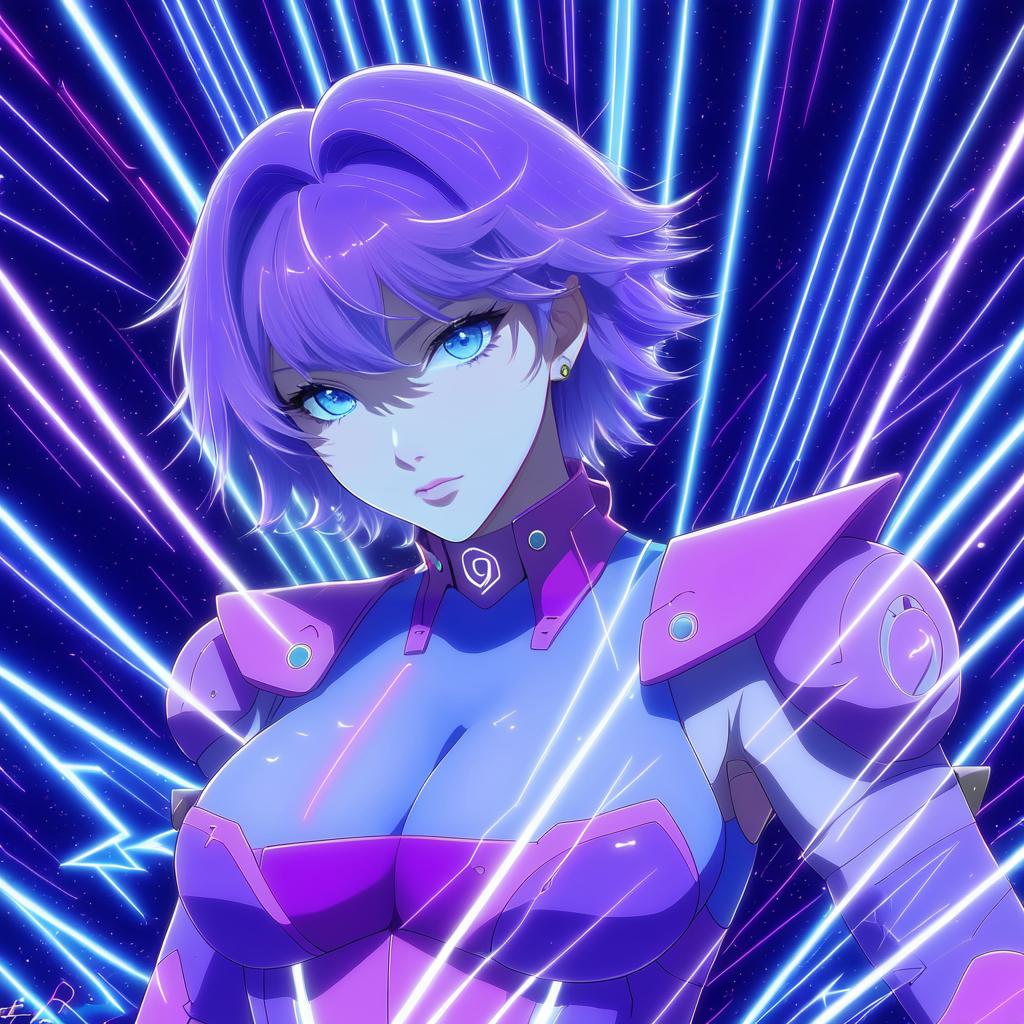 Digital illustration of a female anime character with short purple hair and bright blue eyes. She is wearing futuristic pink and purple armor with a matching choker, set against a background of vibrant blue and purple neon light streaks, creating a dynamic sci-fi atmosphere.