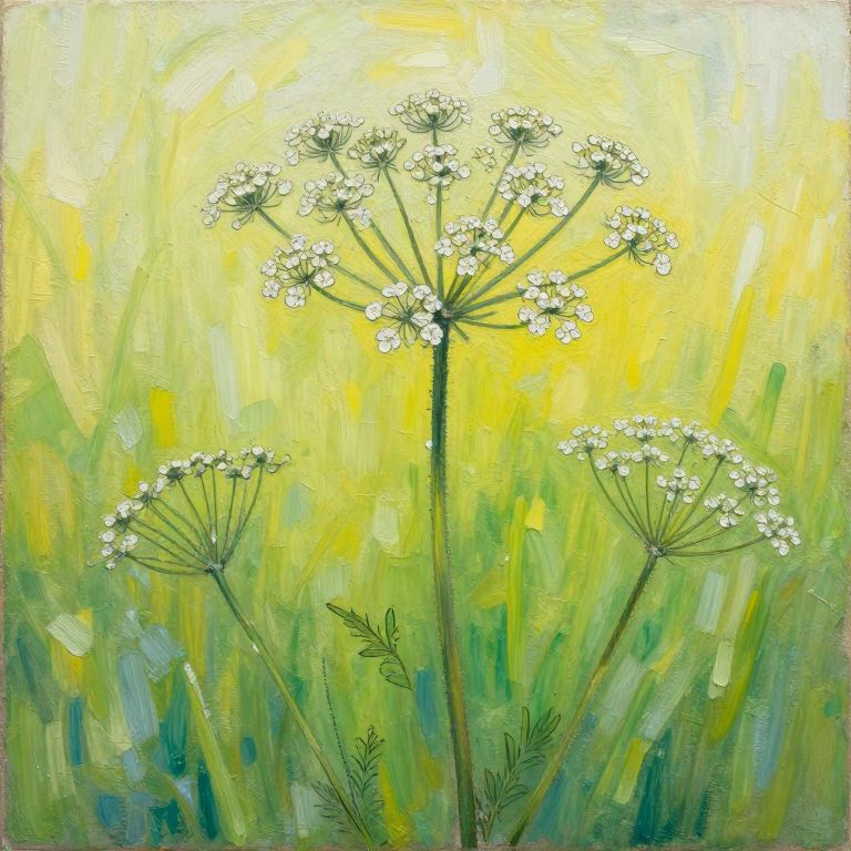 Vibrant textured mixed media artwork depicting a cluster of Cow Parsley with delicate white flower heads and slender green stems, set against a gradient background transitioning from soft blue to pale yellow, interspersed with smaller blossoms and subtle highlights.
