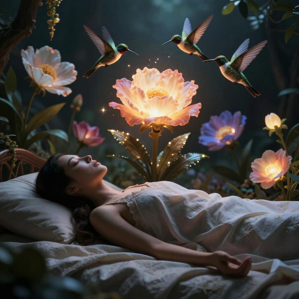 Photograph of a serene woman lying on a pillow, surrounded by glowing flowers and two hummingbirds, illuminated by a bright lotus flower in a dark