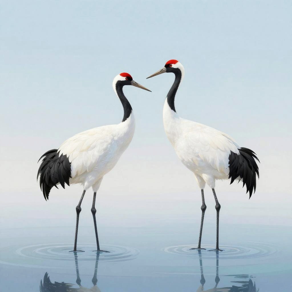A serene digital painting of two elegant white cranes with black necks and red crowns standing in shallow, reflective water. Their long legs are slender and black, and their feathers appear soft and slightly ruffled. The background is a gentle gradient of light blue to white, creating a calm, peaceful atmosphere. The cranes' reflections in the water add a sense of symmetry and tranquility.