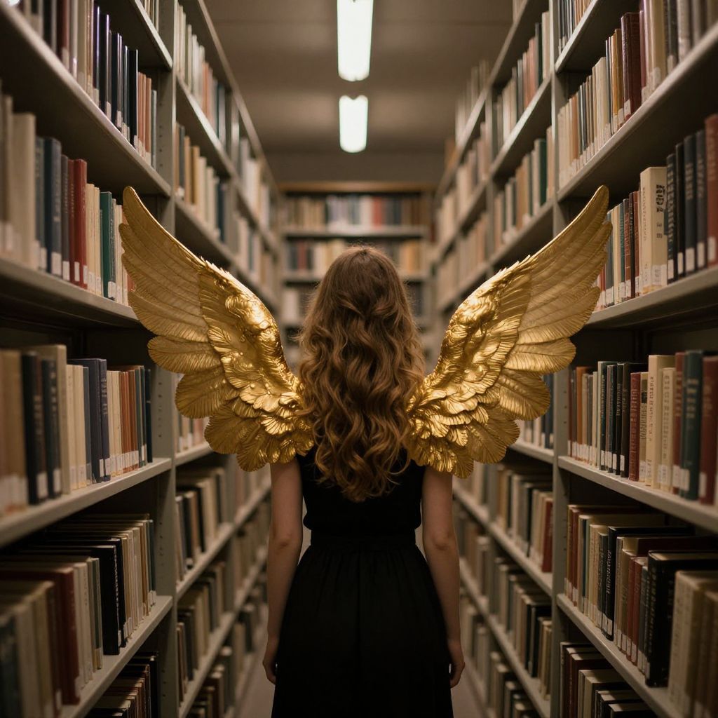 A woman with golden wings stands amidst towering bookshelves in a dimly lit library, her back turned as she gazes down the aisle lined with countless volumes under fluorescent lights.