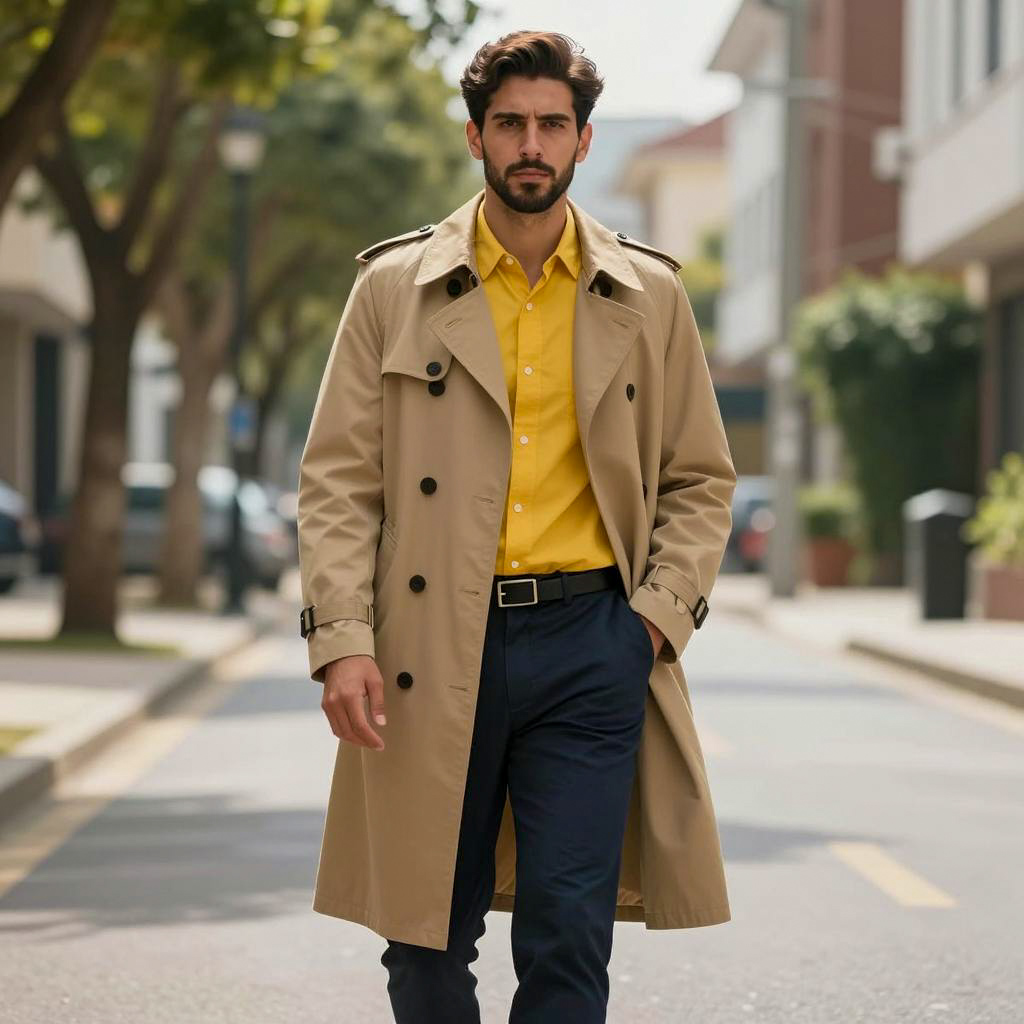 Sweater male stylish costume, photorealistic, young man, standing, city street background, daytime, summer, medium shot, dark gray ribbed sweater, short brown hair, well-groomed beard, serious expression, green trees, blurry streetlights, potted plants, modern urban setting, natural light, realistic shadows, contemporary fashion, casual style, handsome, middle eastern ethnicity, modern city atmosphere, urban environment